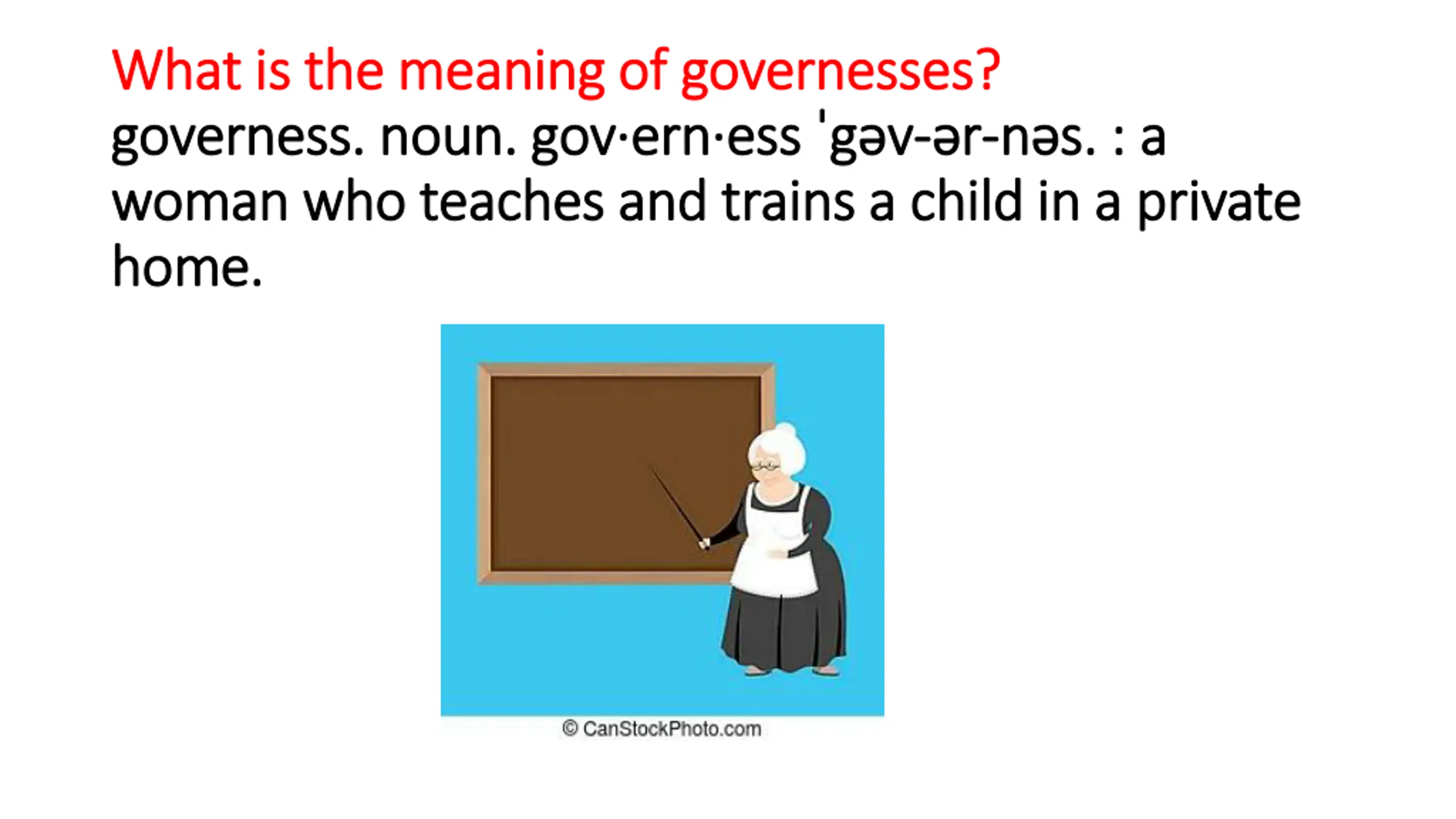 What is the meaning of governesses? What is the meaning of governesses? governess. noun. gov ern governess. noun. gov ern ess woman who teaches and trains a child in a private woman who teaches and trains a child in a private home. home. ess g v g v- - r r- -n s n s. : . : a a