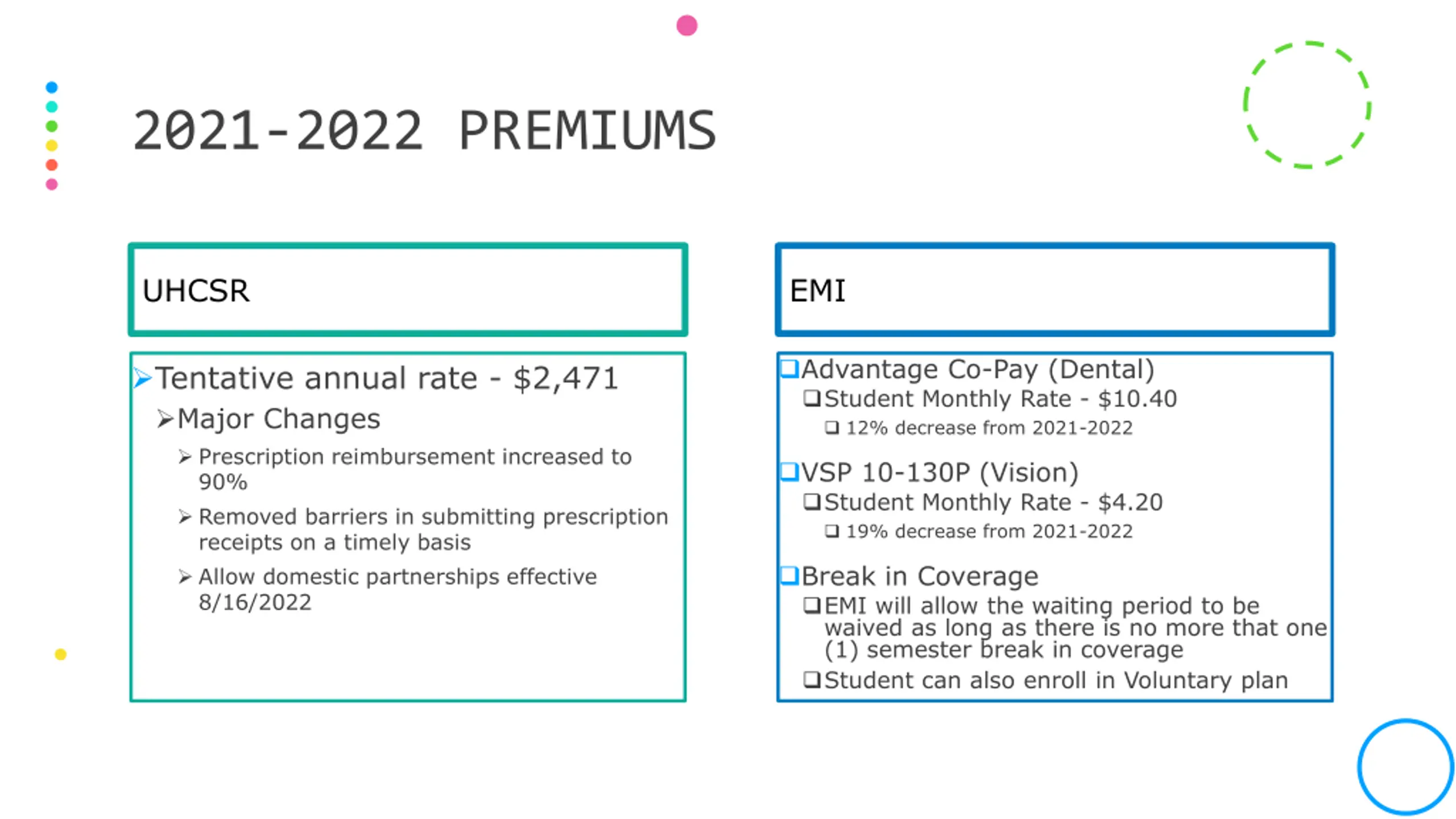 2021-2022 PREMIUMS UHCSR EMI Advantage Co-Pay (Dental) Student Monthly Rate - $10.40 12% decrease from 2021-2022 Tentative annual rate - $2,471 Major Changes Prescription reimbursement increased to 90% Removed barriers in submitting prescription receipts on a timely basis Allow domestic partnerships effective 8/16/2022 VSP 10-130P (Vision) Student Monthly Rate - $4.20 19% decrease from 2021-2022 Break in Coverage EMI will allow the waiting period to be waived as long as there is no more that one (1) semester break in coverage Student can also enroll in Voluntary plan