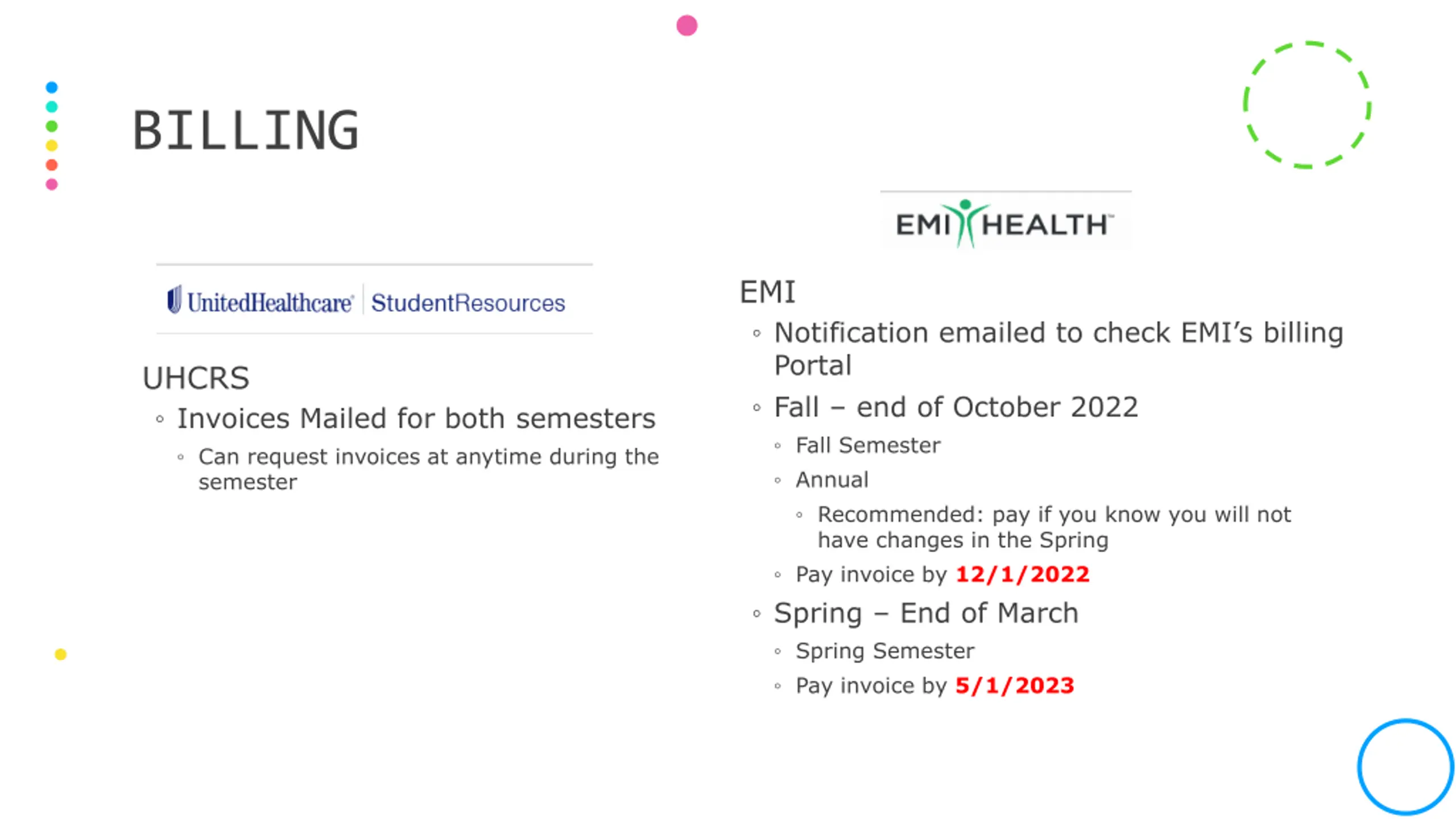 BILLING EMI Notification emailed to check EMI s billing Portal Fall end of October 2022 Fall Semester Annual Recommended: pay if you know you will not have changes in the Spring Pay invoice by 12/1/2022 Spring End of March Spring Semester Pay invoice by 5/1/2023 UHCRS Invoices Mailed for both semesters Can request invoices at anytime during the semester