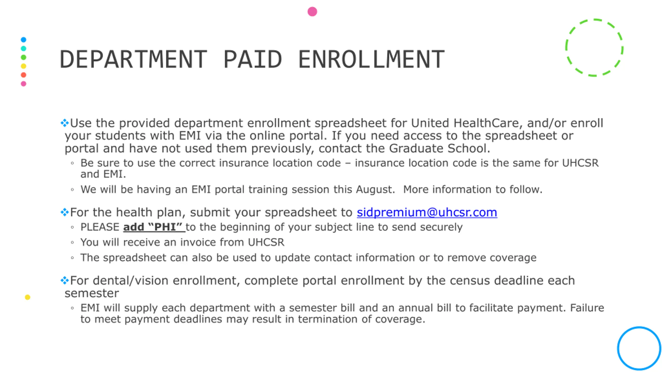 DEPARTMENT PAID ENROLLMENT Use the provided department enrollment spreadsheet for United HealthCare, and/or enroll your students with EMI via the online portal. If you need access to the spreadsheet or portal and have not used them previously, contact the Graduate School. Be sure to use the correct insurance location code insurance location code is the same for UHCSR and EMI. We will be having an EMI portal training session this August. More information to follow. For the health plan, submit your spreadsheet to sidpremium@uhcsr.com PLEASE add PHI to the beginning of your subject line to send securely You will receive an invoice from UHCSR The spreadsheet can also be used to update contact information or to remove coverage For dental/vision enrollment, complete portal enrollment by the census deadline each semester EMI will supply each department with a semester bill and an annual bill to facilitate payment. Failure to meet payment deadlines may result in termination of coverage.