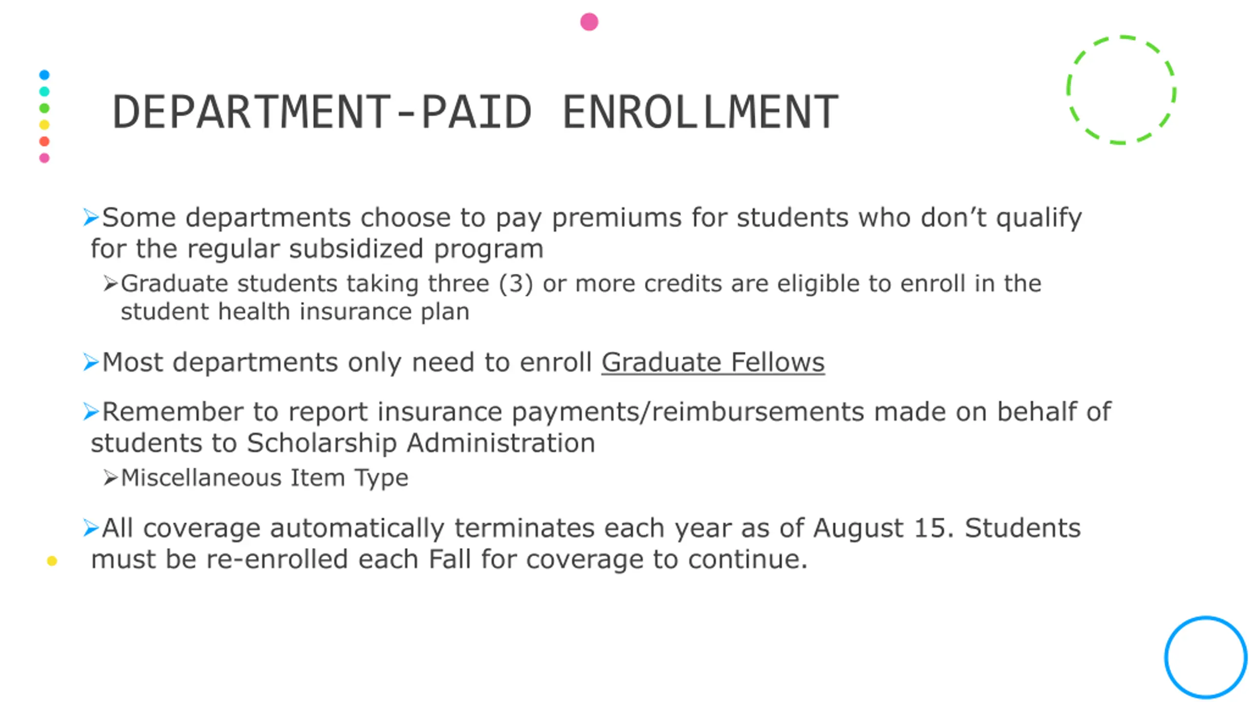 DEPARTMENT-PAID ENROLLMENT Some departments choose to pay premiums for students who don t qualify for the regular subsidized program Graduate students taking three (3) or more credits are eligible to enroll in the student health insurance plan Most departments only need to enroll Graduate Fellows Remember to report insurance payments/reimbursements made on behalf of students to Scholarship Administration Miscellaneous Item Type All coverage automatically terminates each year as of August 15. Students must be re-enrolled each Fall for coverage to continue.