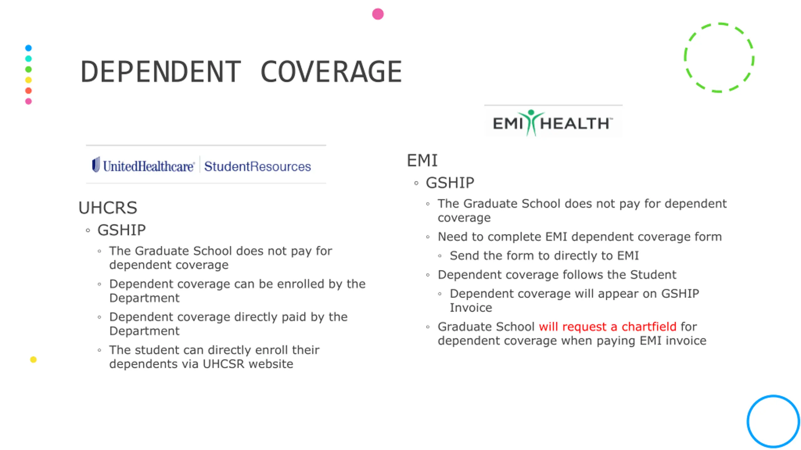 DEPENDENT COVERAGE EMI GSHIP The Graduate School does not pay for dependent coverage Need to complete EMI dependent coverage form Send the form to directly to EMI Dependent coverage follows the Student Dependent coverage will appear on GSHIP Invoice Graduate School will request a chartfield for dependent coverage when paying EMI invoice UHCRS GSHIP The Graduate School does not pay for dependent coverage Dependent coverage can be enrolled by the Department Dependent coverage directly paid by the Department The student can directly enroll their dependents via UHCSR website