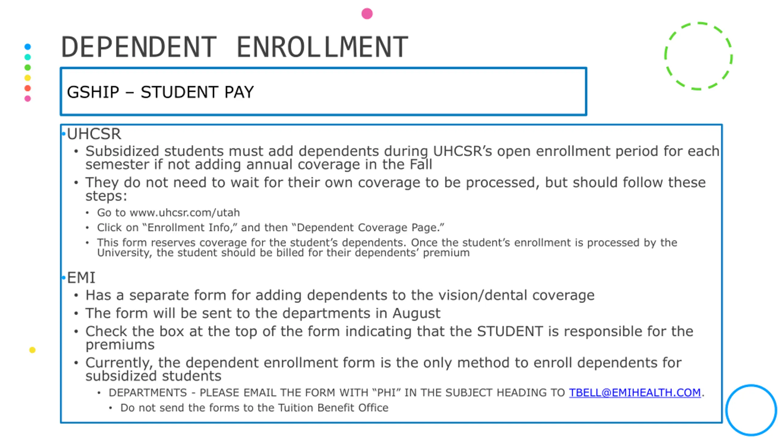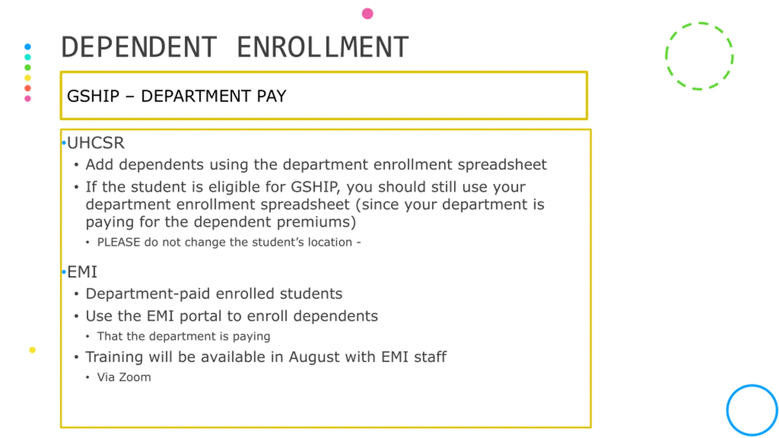 DEPENDENT ENROLLMENT GSHIP DEPARTMENT PAY UHCSR Add dependents using the department enrollment spreadsheet If the student is eligible for GSHIP, you should still use your department enrollment spreadsheet (since your department is paying for the dependent premiums) PLEASE do not change the student s location - EMI Department-paid enrolled students Use the EMI portal to enroll dependents That the department is paying Training will be available in August with EMI staff Via Zoom