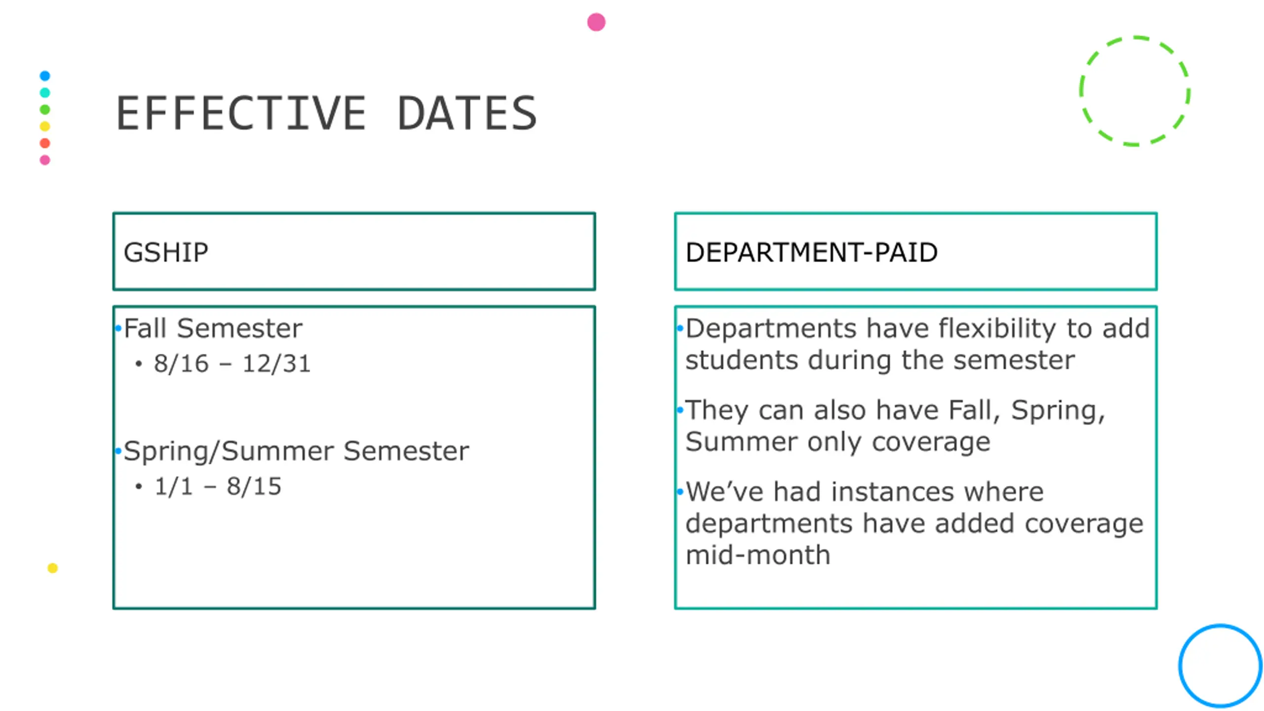 EFFECTIVE DATES GSHIP DEPARTMENT-PAID Fall Semester 8/16 12/31 Departments have flexibility to add students during the semester They can also have Fall, Spring, Summer only coverage Spring/Summer Semester 1/1 8/15 We ve had instances where departments have added coverage mid-month