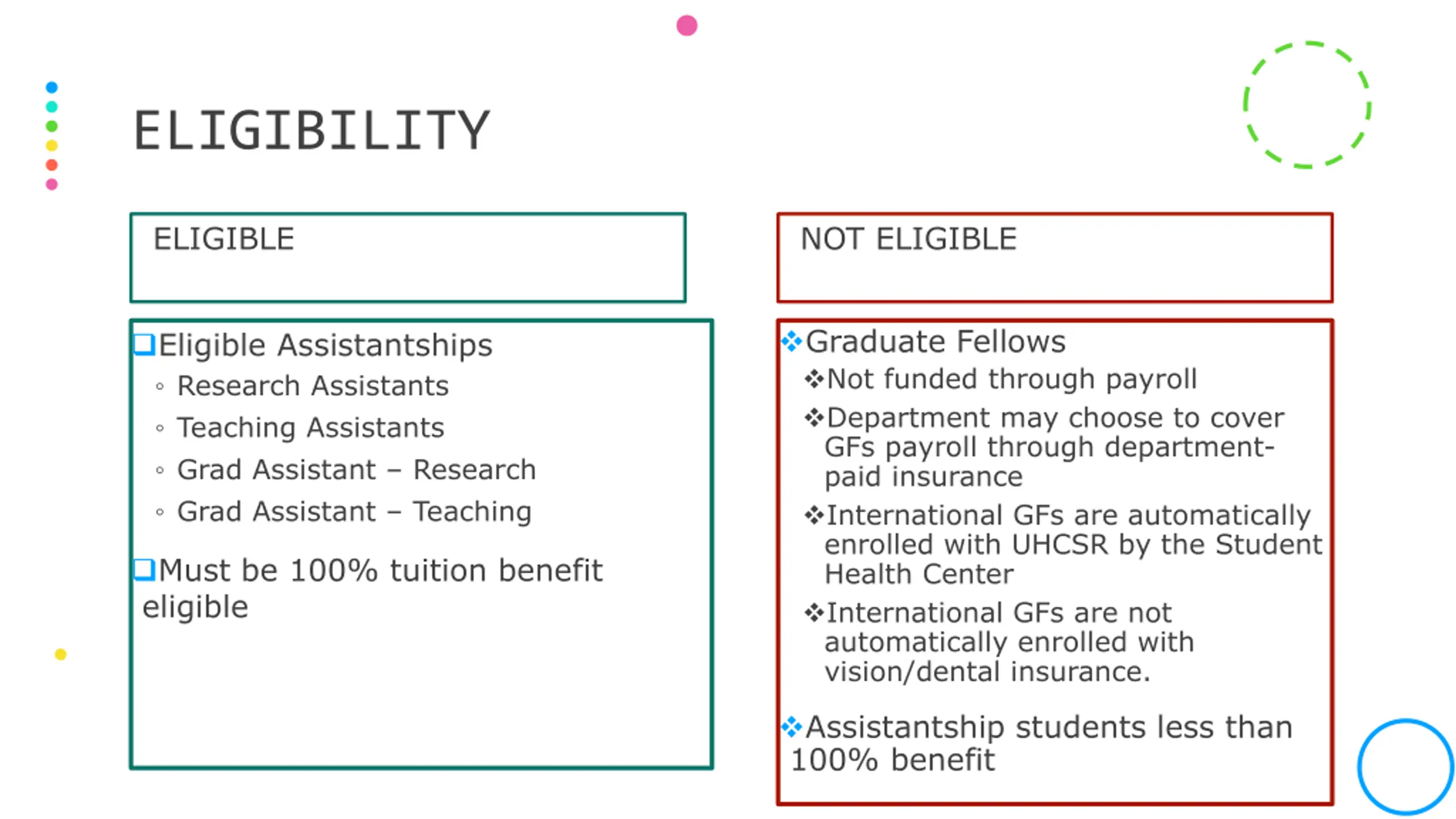 ELIGIBILITY ELIGIBLE NOT ELIGIBLE Graduate Fellows Not funded through payroll Department may choose to cover GFs payroll through department- paid insurance International GFs are automatically enrolled with UHCSR by the Student Health Center International GFs are not automatically enrolled with vision/dental insurance. Eligible Assistantships Research Assistants Teaching Assistants Grad Assistant Research Grad Assistant Teaching Must be 100% tuition benefit eligible Assistantship students less than 100% benefit