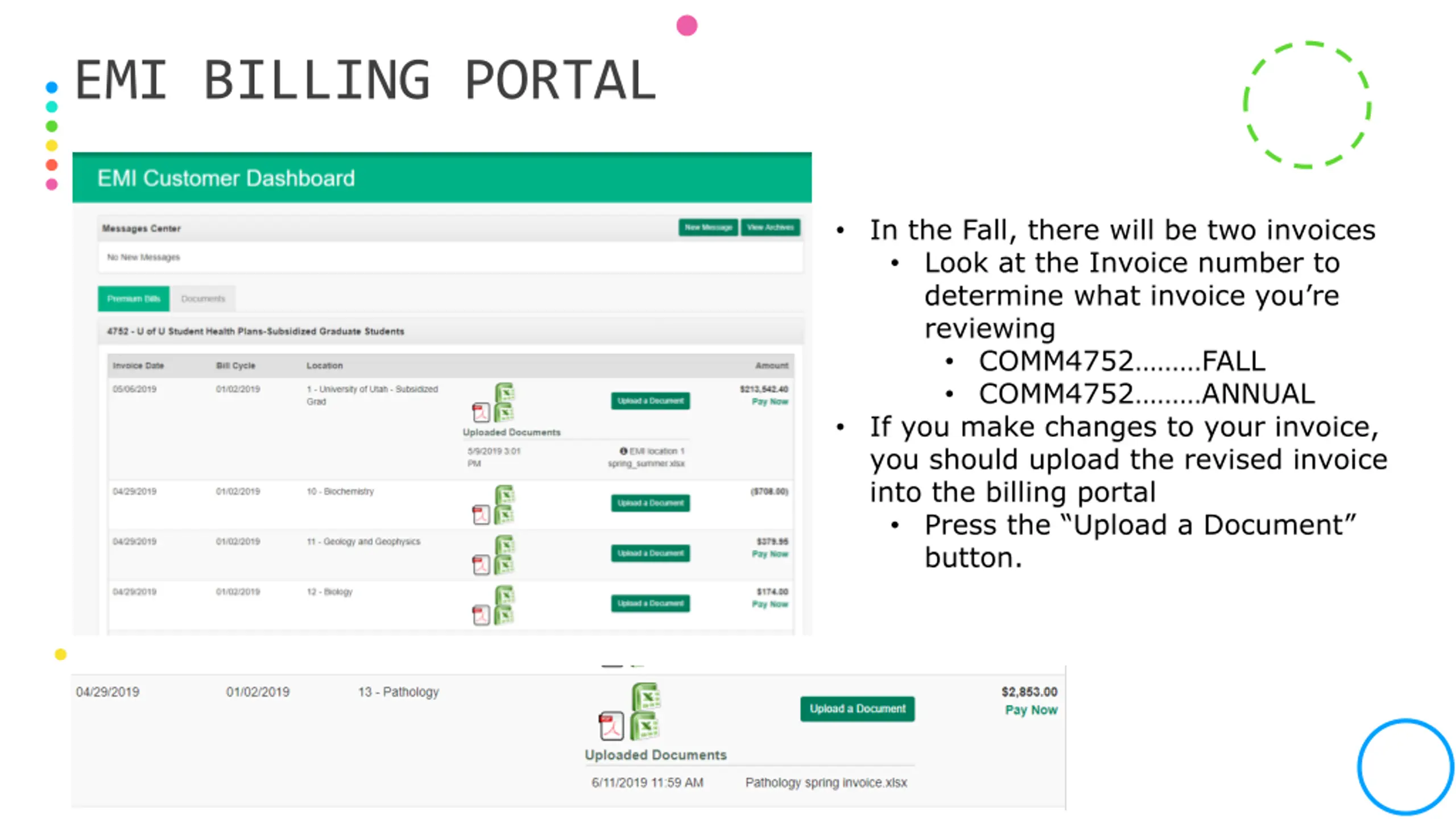 EMI BILLING PORTAL In the Fall, there will be two invoices Look at the Invoice number to determine what invoice you re reviewing COMM4752 FALL COMM4752 ANNUAL If you make changes to your invoice, you should upload the revised invoice into the billing portal Press the Upload a Document button.