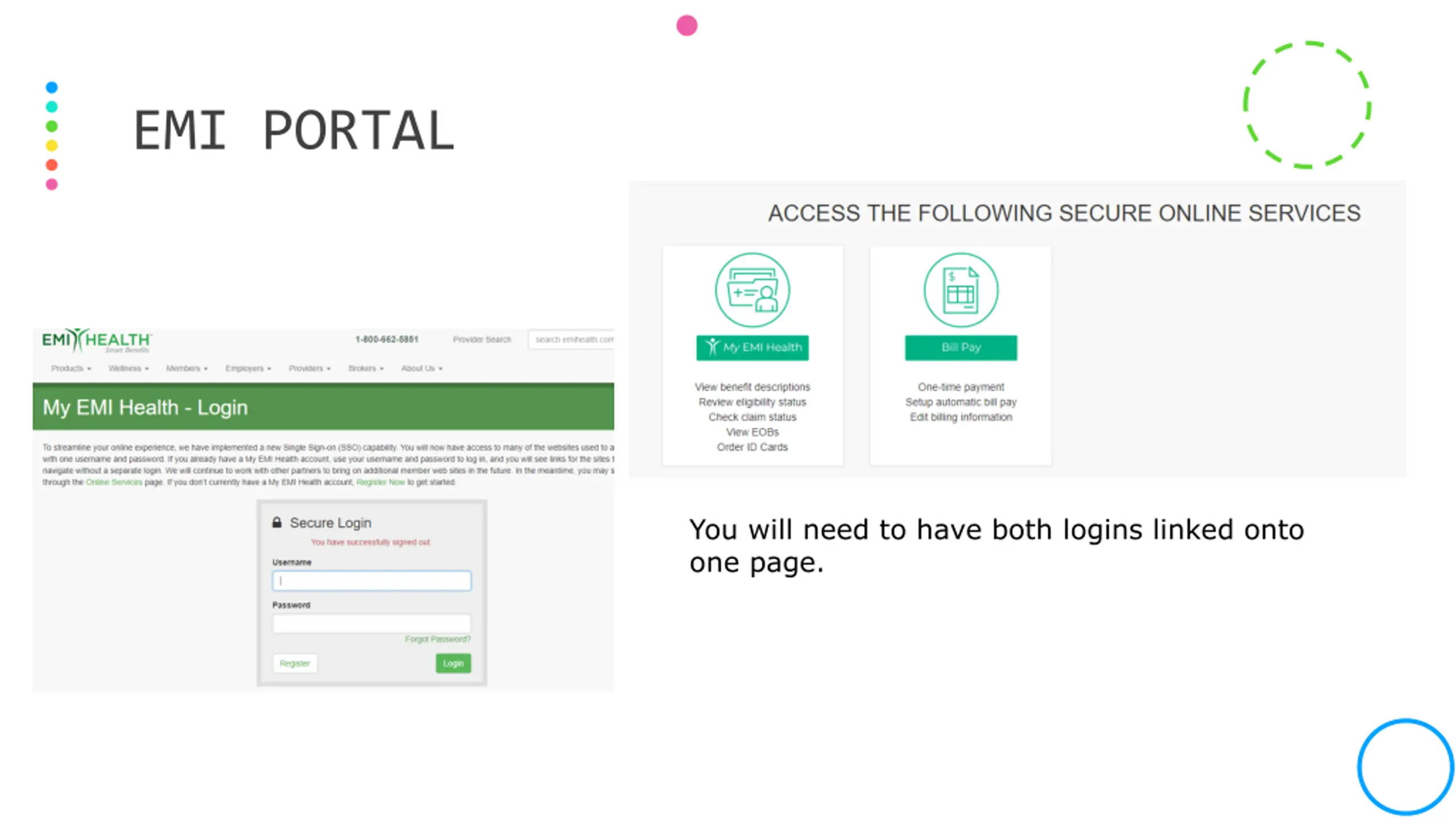 EMI PORTAL You will need to have both logins linked onto one page.