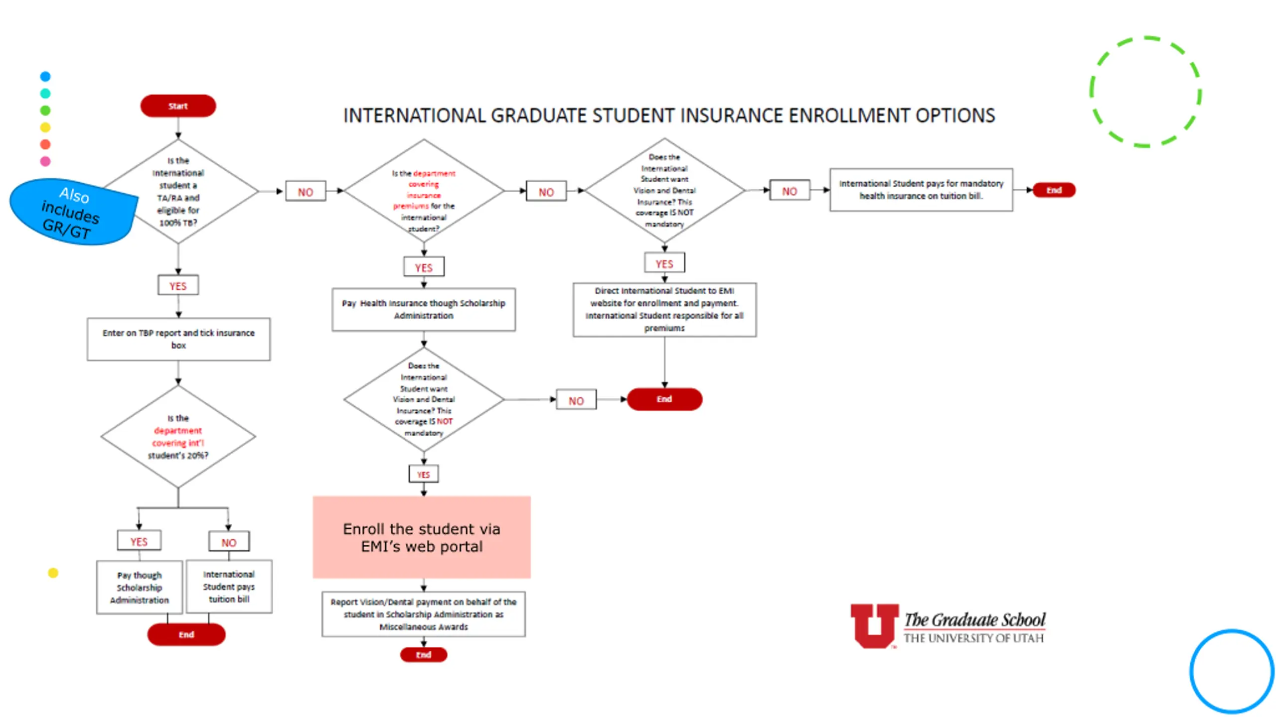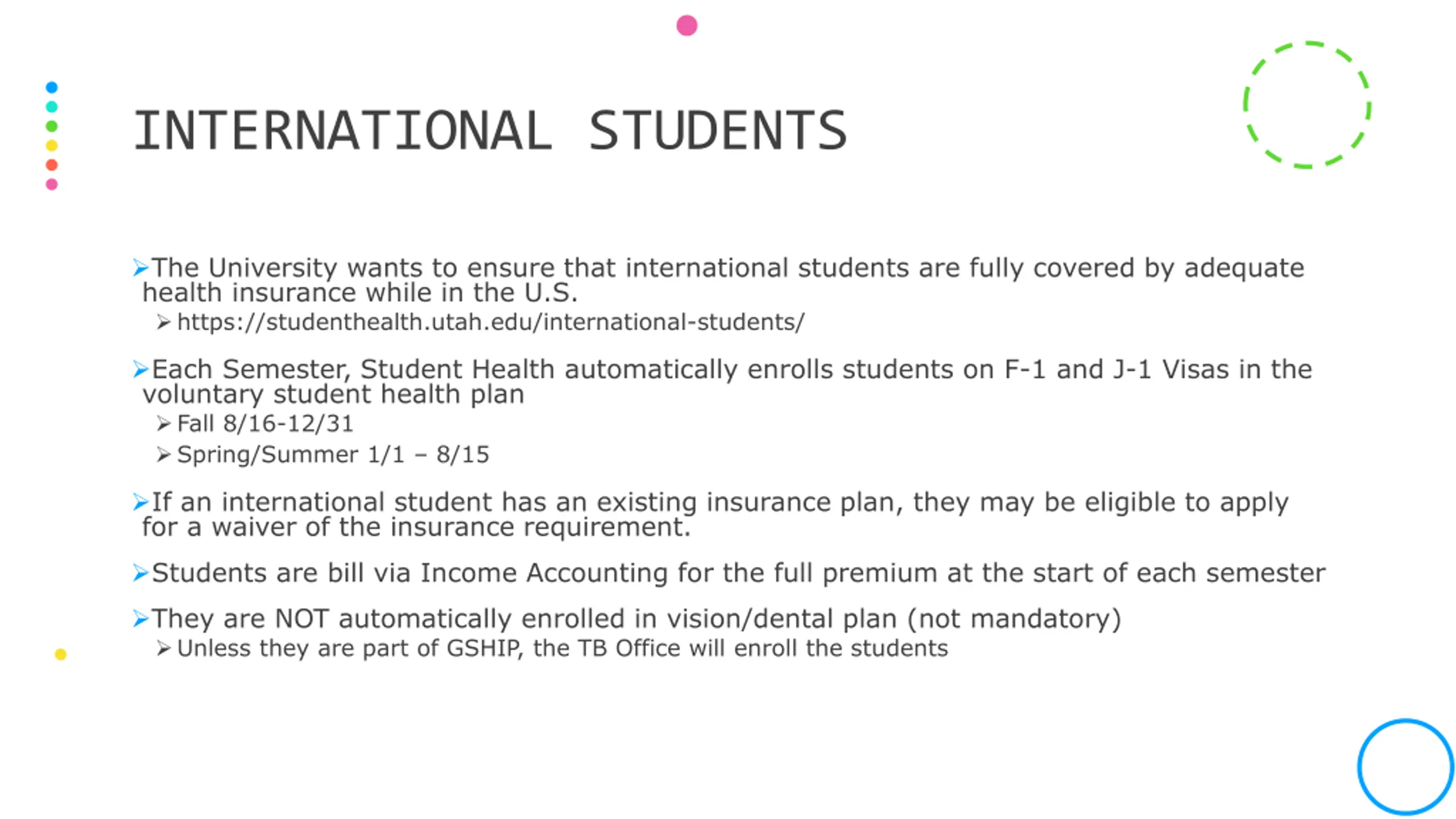 INTERNATIONAL STUDENTS The University wants to ensure that international students are fully covered by adequate health insurance while in the U.S. https://studenthealth.utah.edu/international-students/ Each Semester, Student Health automatically enrolls students on F-1 and J-1 Visas in the voluntary student health plan Fall 8/16-12/31 Spring/Summer 1/1 8/15 If an international student has an existing insurance plan, they may be eligible to apply for a waiver of the insurance requirement. Students are bill via Income Accounting for the full premium at the start of each semester They are NOT automatically enrolled in vision/dental plan (not mandatory) Unless they are part of GSHIP, the TB Office will enroll the students