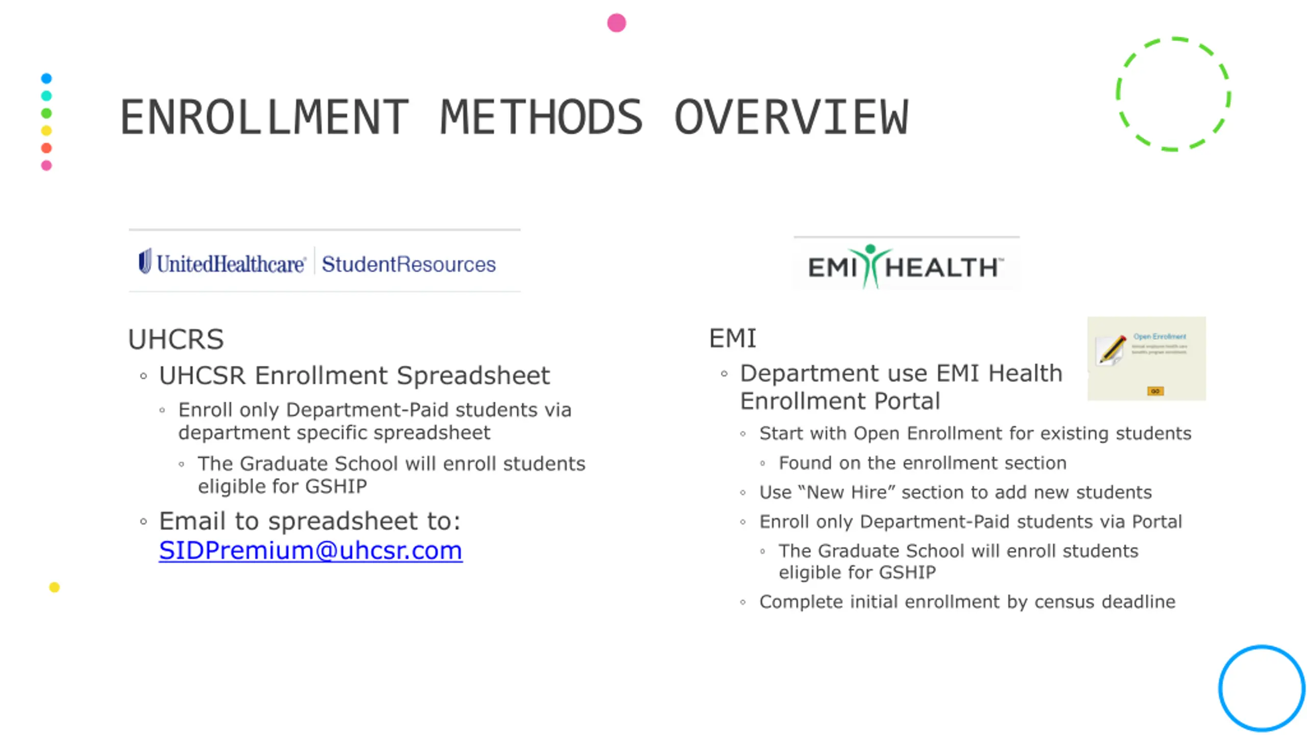 ENROLLMENT METHODS OVERVIEW UHCRS UHCSR Enrollment Spreadsheet Enroll only Department-Paid students via department specific spreadsheet The Graduate School will enroll students eligible for GSHIP Email to spreadsheet to: SIDPremium@uhcsr.com EMI Department use EMI Health Enrollment Portal Start with Open Enrollment for existing students Found on the enrollment section Use New Hire section to add new students Enroll only Department-Paid students via Portal The Graduate School will enroll students eligible for GSHIP Complete initial enrollment by census deadline