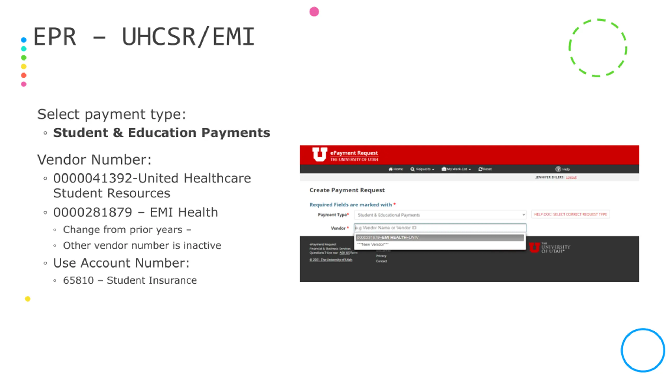 EPR UHCSR/EMI Select payment type: Student & Education Payments Vendor Number: 0000041392-United Healthcare Student Resources 0000281879 EMI Health Change from prior years Other vendor number is inactive Use Account Number: 65810 Student Insurance