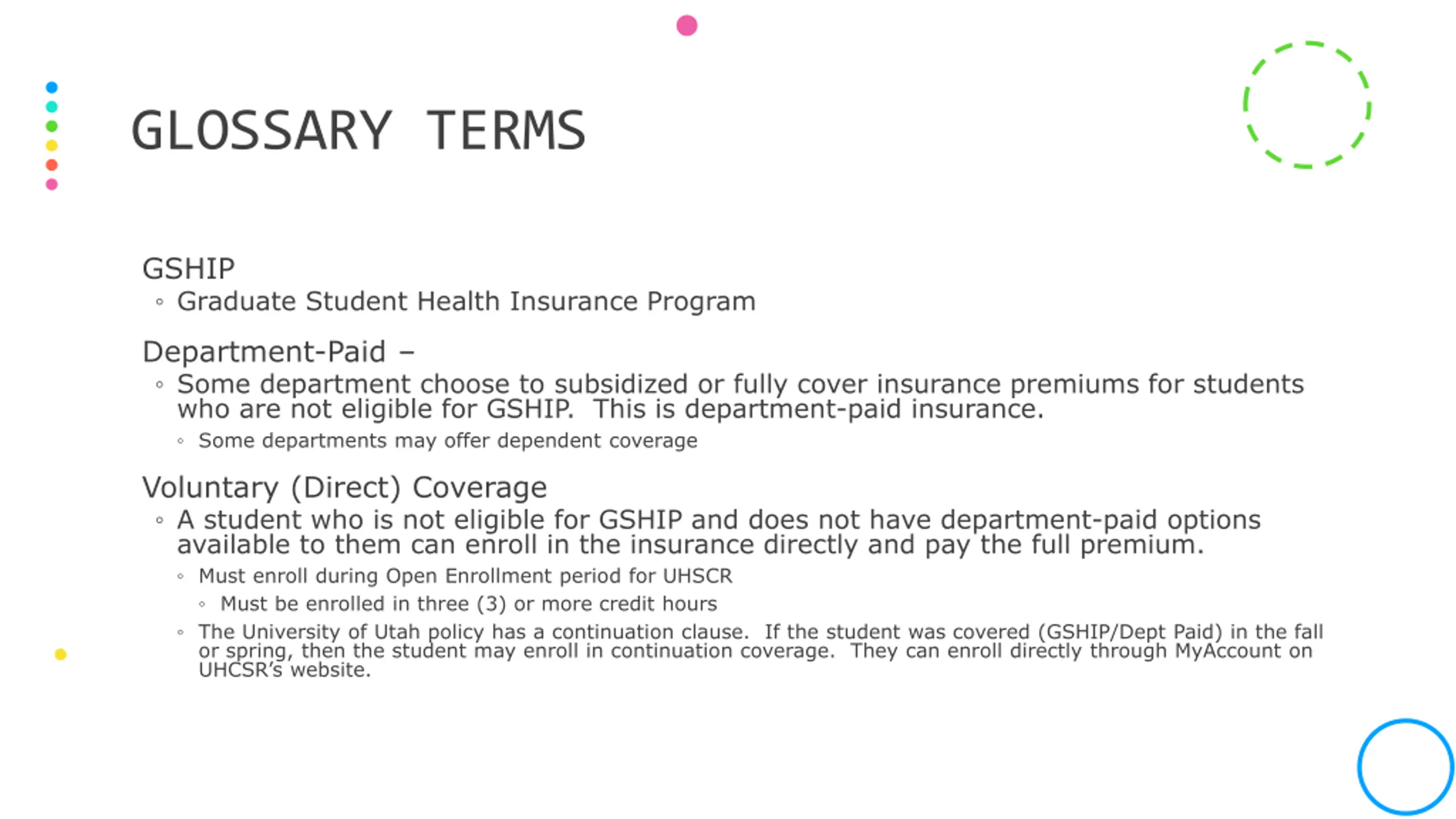 GLOSSARY TERMS GSHIP Graduate Student Health Insurance Program Department-Paid Some department choose to subsidized or fully cover insurance premiums for students who are not eligible for GSHIP. This is department-paid insurance. Some departments may offer dependent coverage Voluntary (Direct) Coverage A student who is not eligible for GSHIP and does not have department-paid options available to them can enroll in the insurance directly and pay the full premium. Must enroll during Open Enrollment period for UHSCR Must be enrolled in three (3) or more credit hours The University of Utah policy has a continuation clause. If the student was covered (GSHIP/Dept Paid) in the fall or spring, then the student may enroll in continuation coverage. They can enroll directly through MyAccount on UHCSR s website.