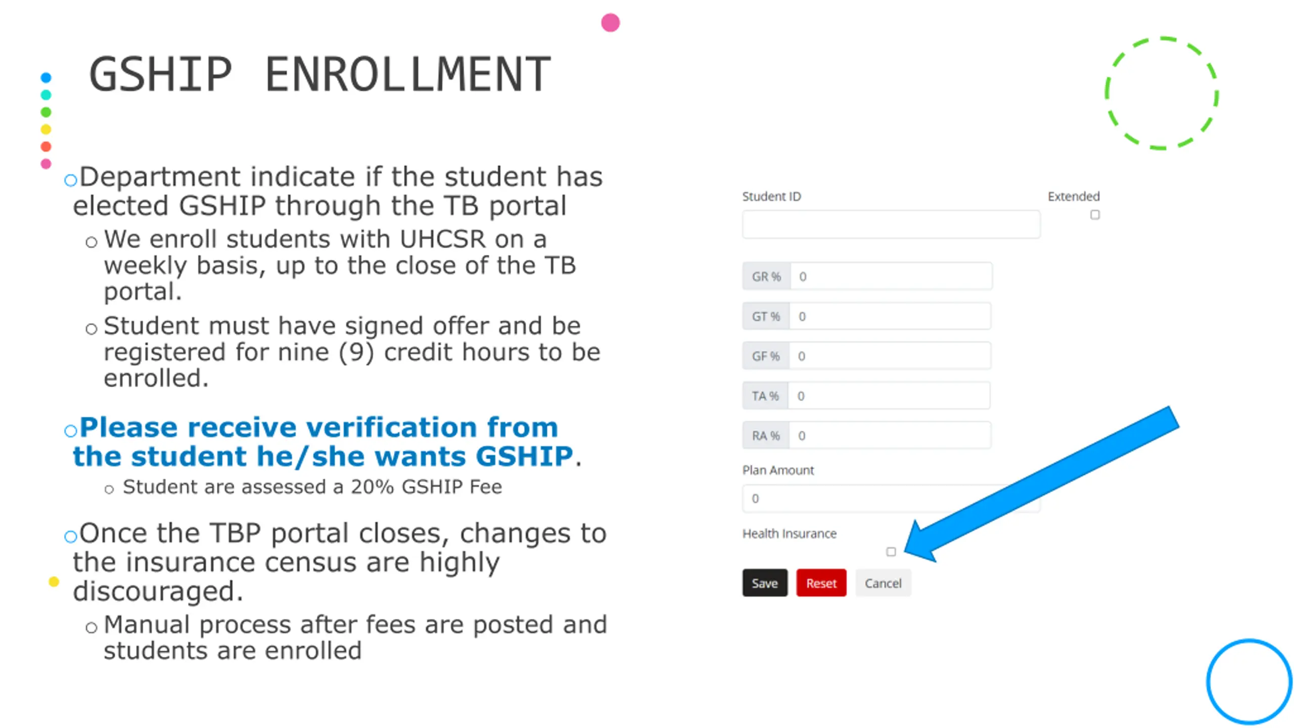 GSHIP ENROLLMENT oDepartment indicate if the student has elected GSHIP through the TB portal oWe enroll students with UHCSR on a weekly basis, up to the close of the TB portal. oStudent must have signed offer and be registered for nine (9) credit hours to be enrolled. oPlease receive verification from the student he/she wants GSHIP. o Student are assessed a 20% GSHIP Fee oOnce the TBP portal closes, changes to the insurance census are highly discouraged. oManual process after fees are posted and students are enrolled