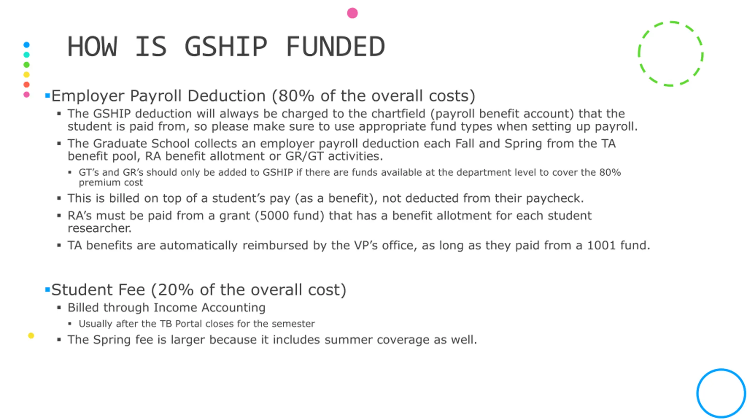 HOW IS GSHIP FUNDED Employer Payroll Deduction (80% of the overall costs) The GSHIP deduction will always be charged to the chartfield (payroll benefit account) that the student is paid from, so please make sure to use appropriate fund types when setting up payroll. The Graduate School collects an employer payroll deduction each Fall and Spring from the TA benefit pool, RA benefit allotment or GR/GT activities. GT s and GR s should only be added to GSHIP if there are funds available at the department level to cover the 80% premium cost This is billed on top of a student s pay (as a benefit), not deducted from their paycheck. RA s must be paid from a grant (5000 fund) that has a benefit allotment for each student researcher. TA benefits are automatically reimbursed by the VP s office, as long as they paid from a 1001 fund. Student Fee (20% of the overall cost) Billed through Income Accounting Usually after the TB Portal closes for the semester The Spring fee is larger because it includes summer coverage as well.