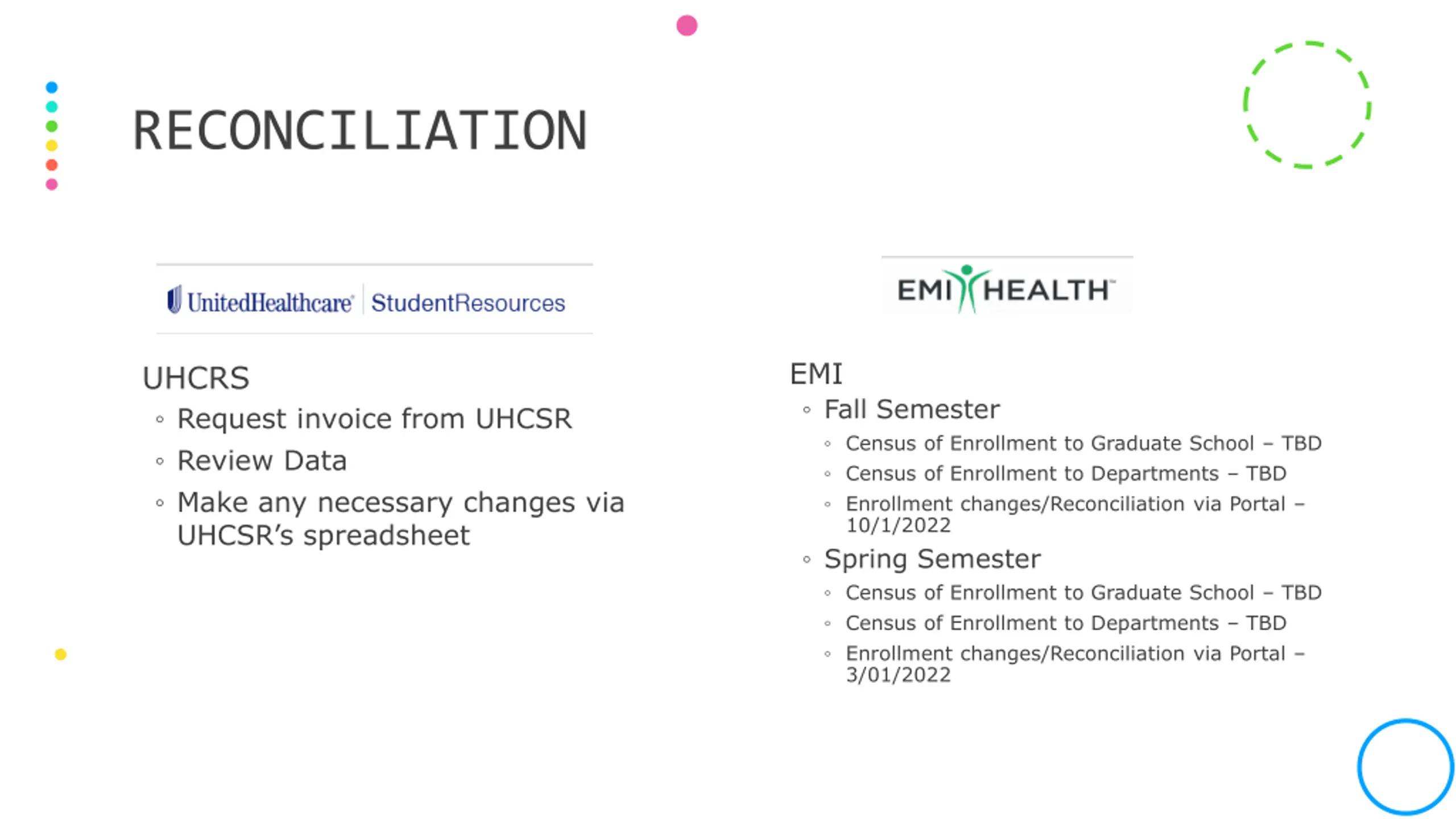 RECONCILIATION EMI Fall Semester Census of Enrollment to Graduate School TBD Census of Enrollment to Departments TBD Enrollment changes/Reconciliation via Portal 10/1/2022 Spring Semester Census of Enrollment to Graduate School TBD Census of Enrollment to Departments TBD Enrollment changes/Reconciliation via Portal 3/01/2022 UHCRS Request invoice from UHCSR Review Data Make any necessary changes via UHCSR s spreadsheet