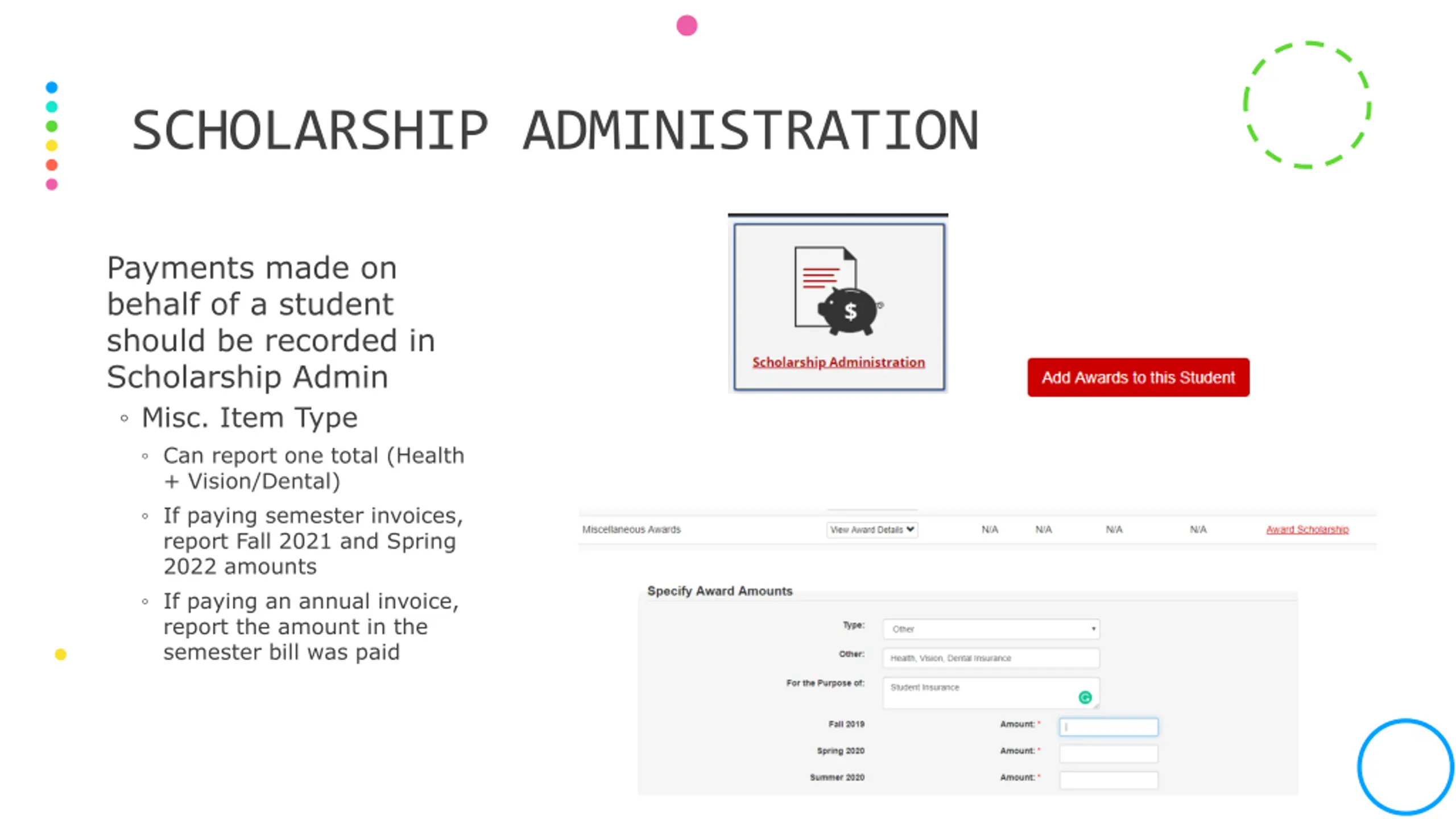 SCHOLARSHIP ADMINISTRATION Payments made on behalf of a student should be recorded in Scholarship Admin Misc. Item Type Can report one total (Health + Vision/Dental) If paying semester invoices, report Fall 2021 and Spring 2022 amounts If paying an annual invoice, report the amount in the semester bill was paid