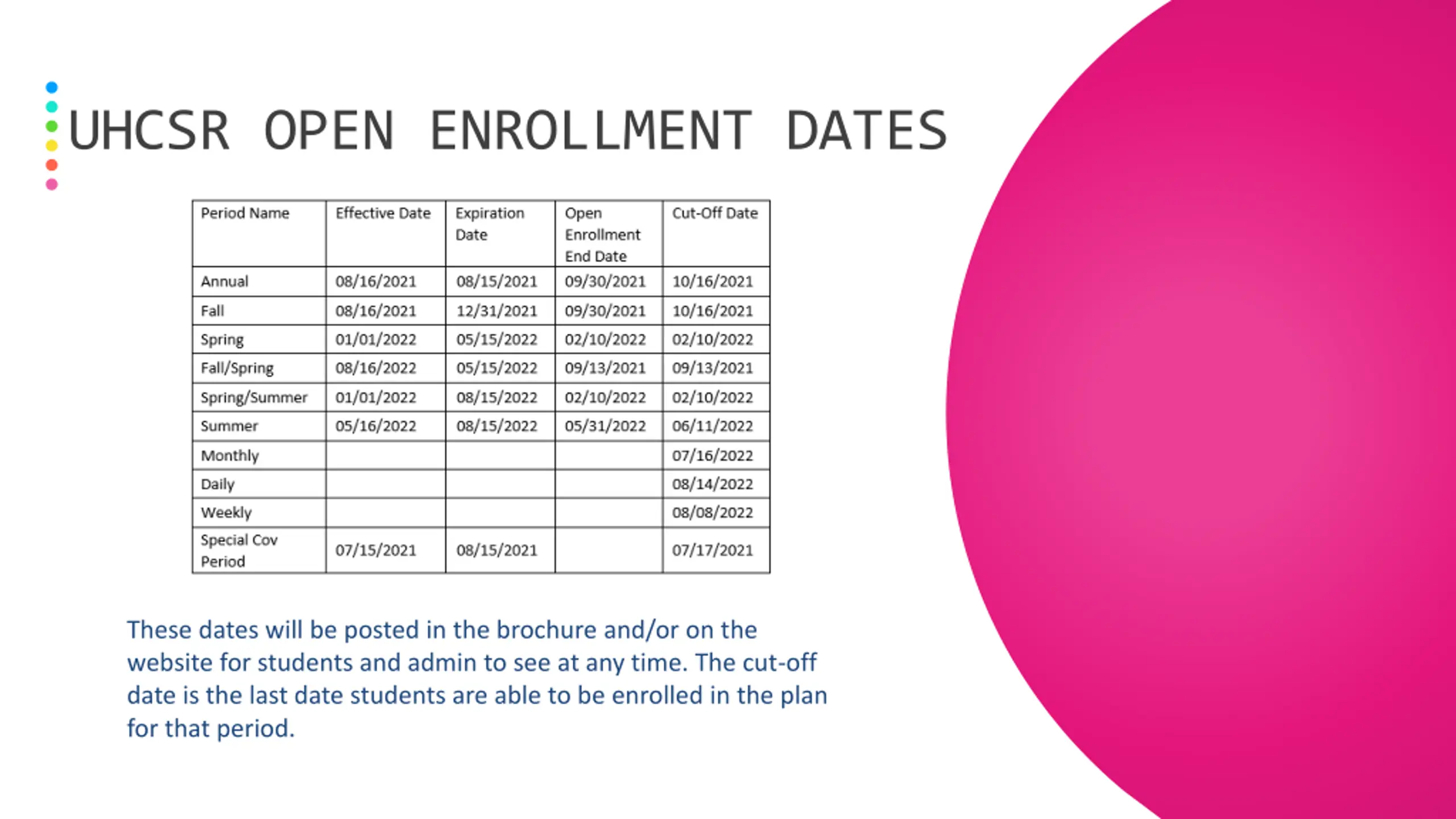 UHCSR OPEN ENROLLMENT DATES These dates will be posted in the brochure and/or on the website for students and admin to see at any time. The cut-off date is the last date students are able to be enrolled in the plan for that period.