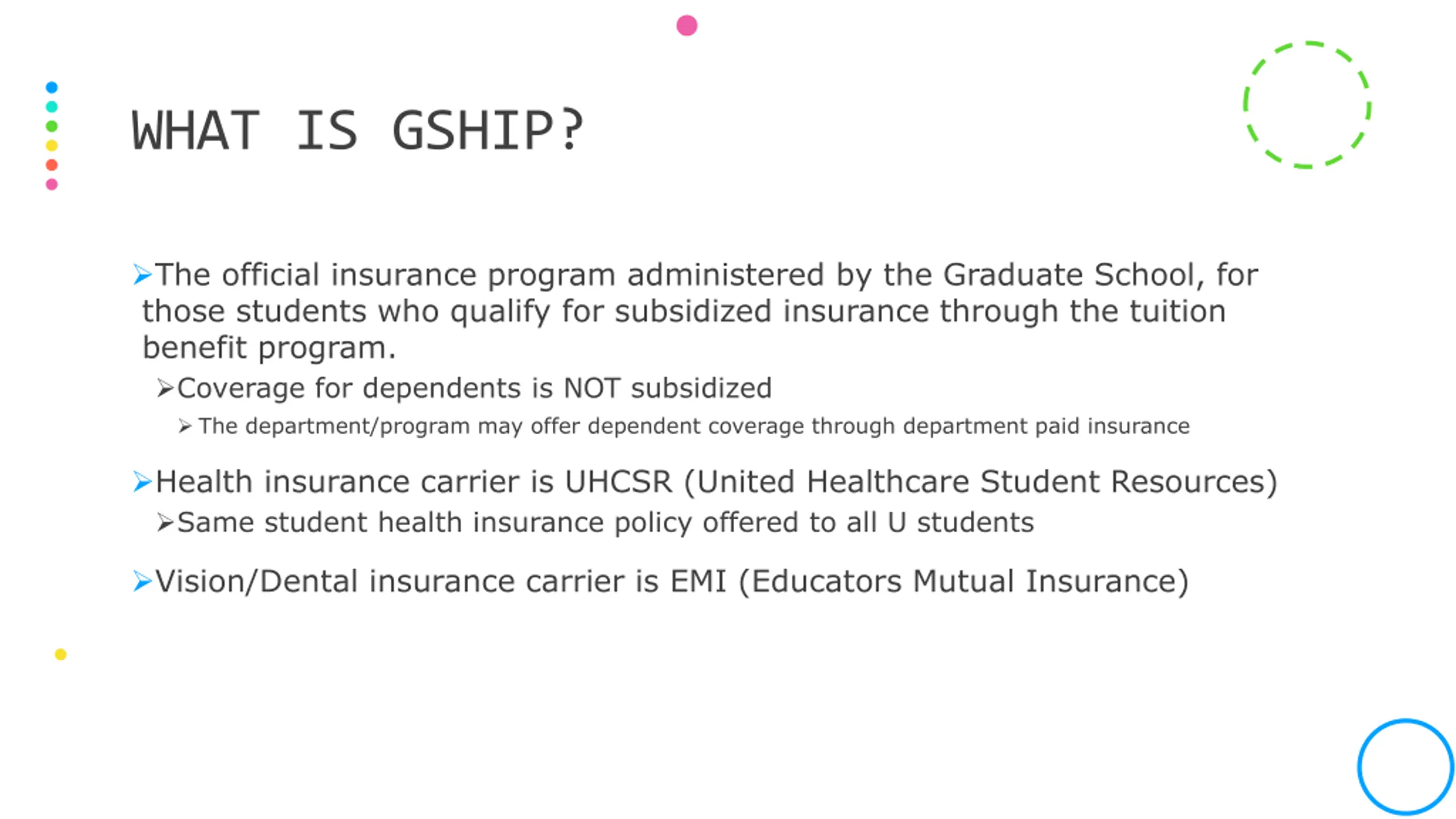 WHAT IS GSHIP? The official insurance program administered by the Graduate School, for those students who qualify for subsidized insurance through the tuition benefit program. Coverage for dependents is NOT subsidized The department/program may offer dependent coverage through department paid insurance Health insurance carrier is UHCSR (United Healthcare Student Resources) Same student health insurance policy offered to all U students Vision/Dental insurance carrier is EMI (Educators Mutual Insurance)