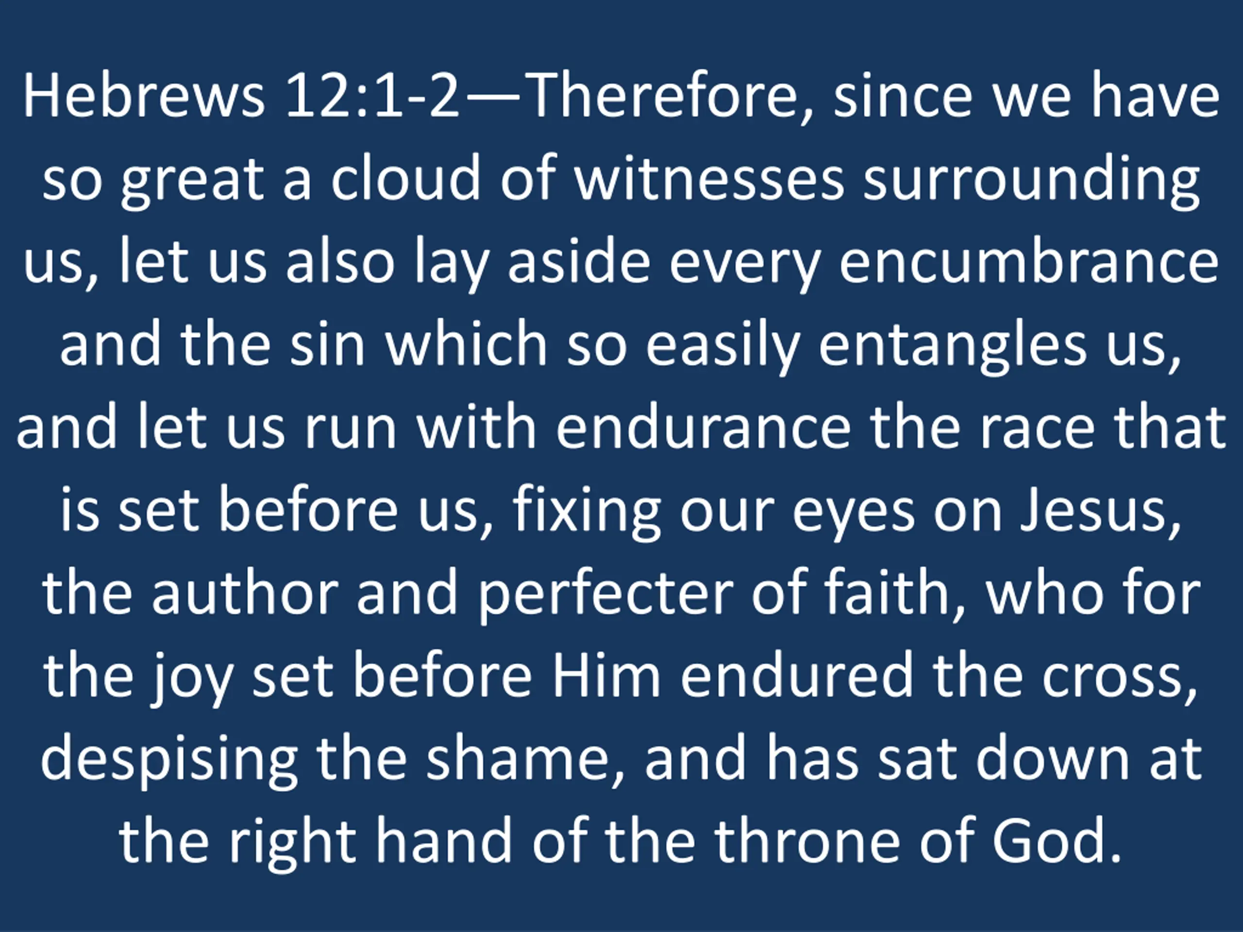 Hebrews 12:1-2Therefore, since we have so great a cloud of witnesses surrounding us, let us also lay aside every encumbrance and the sin which so easily entangles us, and let us run with endurance the race that is set before us, fixing our eyes on Jesus, the author and perfecter of faith, who for the joy set before Him endured the cross, despising the shame, and has sat down at the right hand of the throne of God.