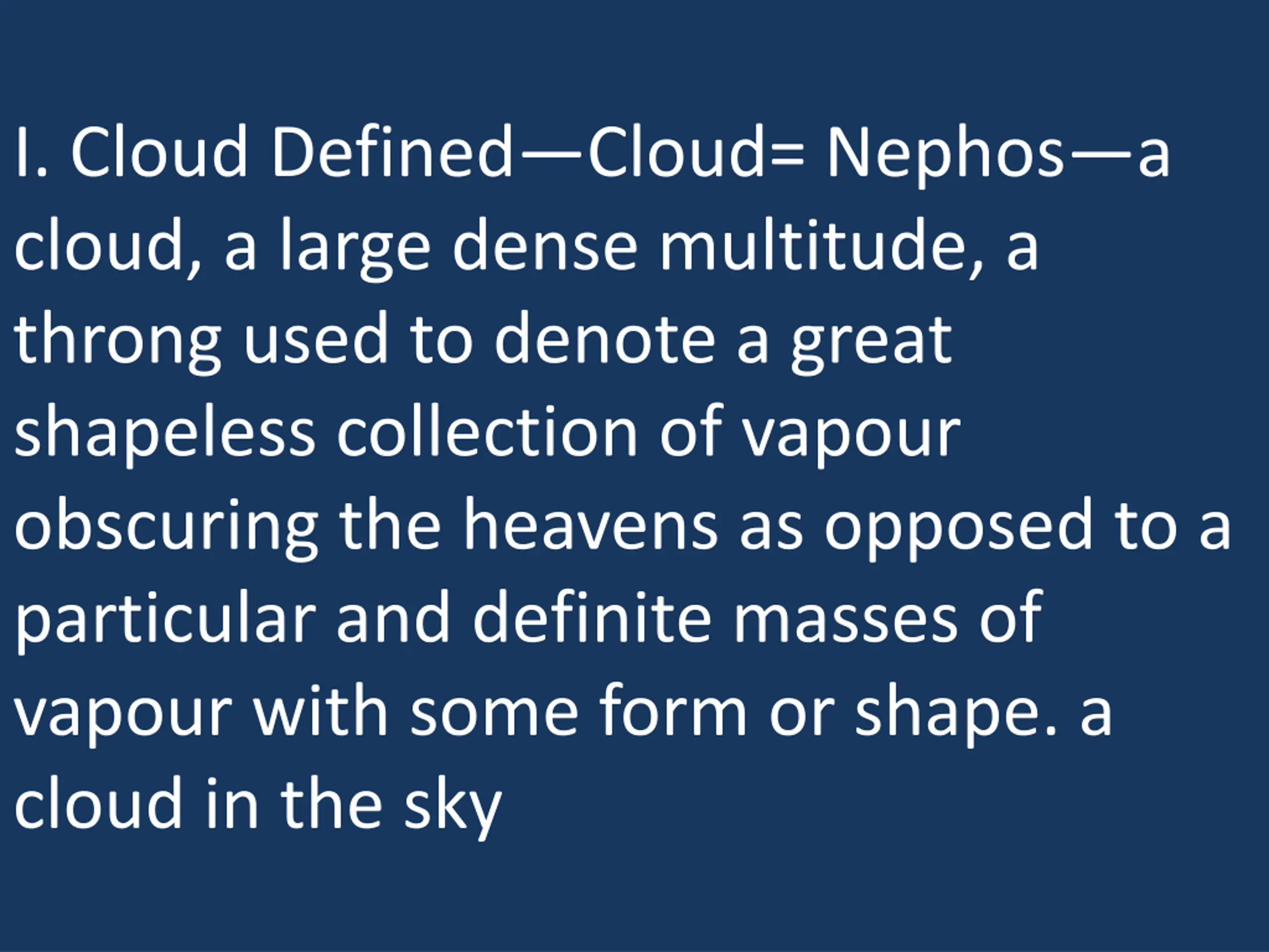 I. Cloud DefinedCloud= Nephosa cloud, a large dense multitude, a throng used to denote a great shapeless collection of vapour obscuring the heavens as opposed to a particular and definite masses of vapour with some form or shape. a cloud in the sky