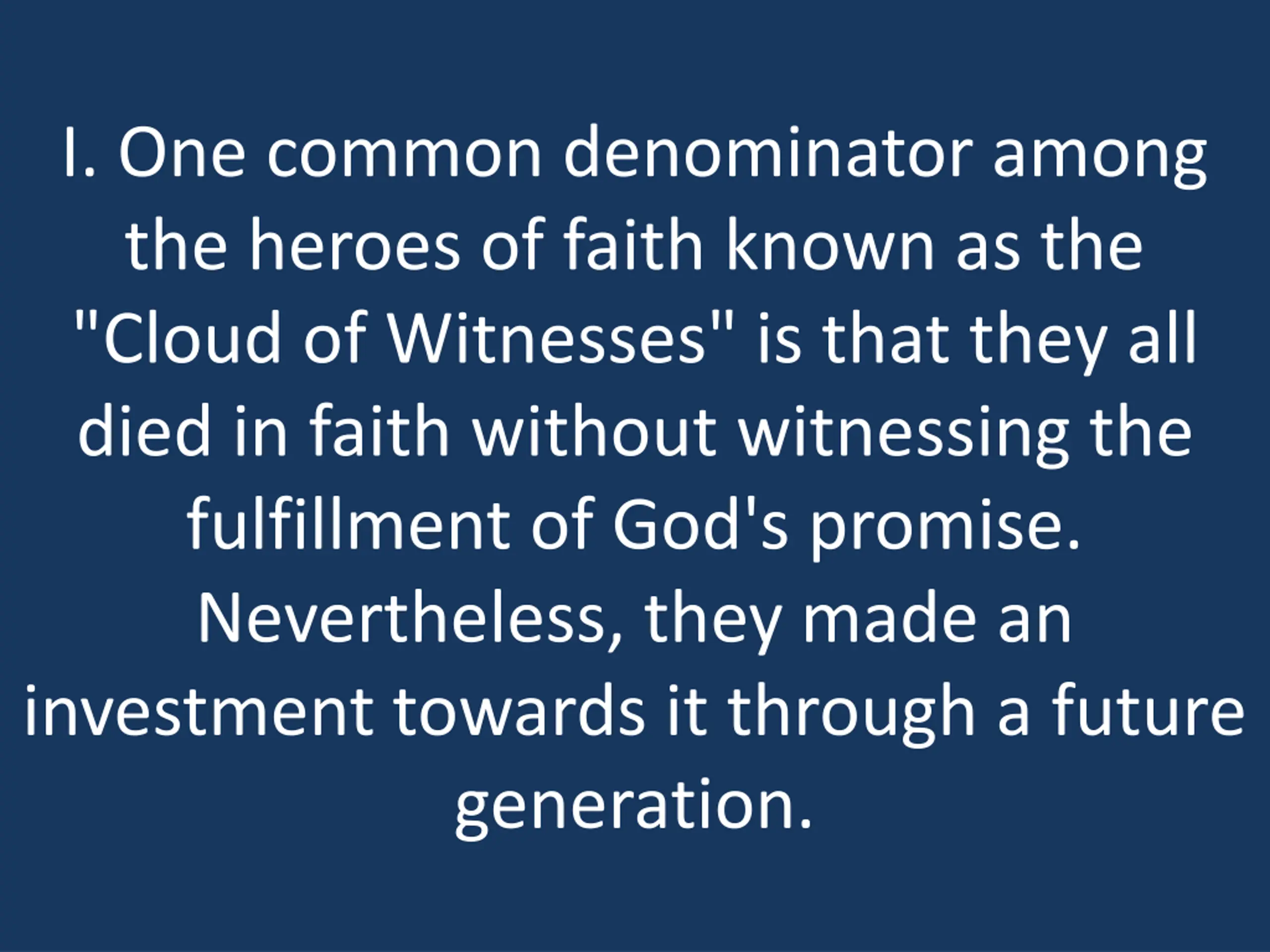 I. One common denominator among the heroes of faith known as the "Cloud of Witnesses" is that they all died in faith without witnessing the fulfillment of God's promise. Nevertheless, they made an investment towards it through a future generation.
