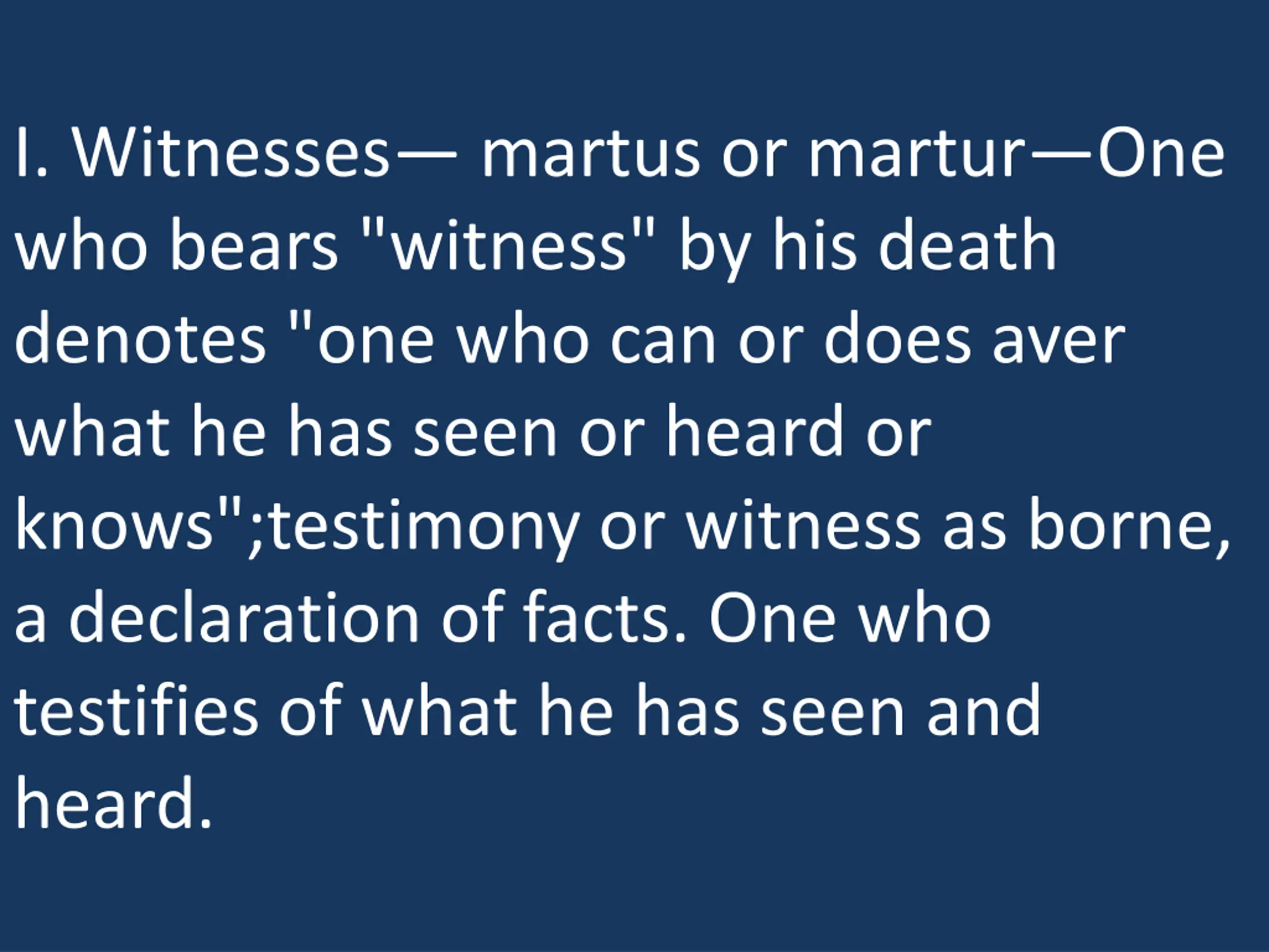 I. Witnesses martus or marturOne who bears "witness" by his death denotes "one who can or does aver what he has seen or heard or knows";testimony or witness as borne, a declaration of facts. One who testifies of what he has seen and heard.