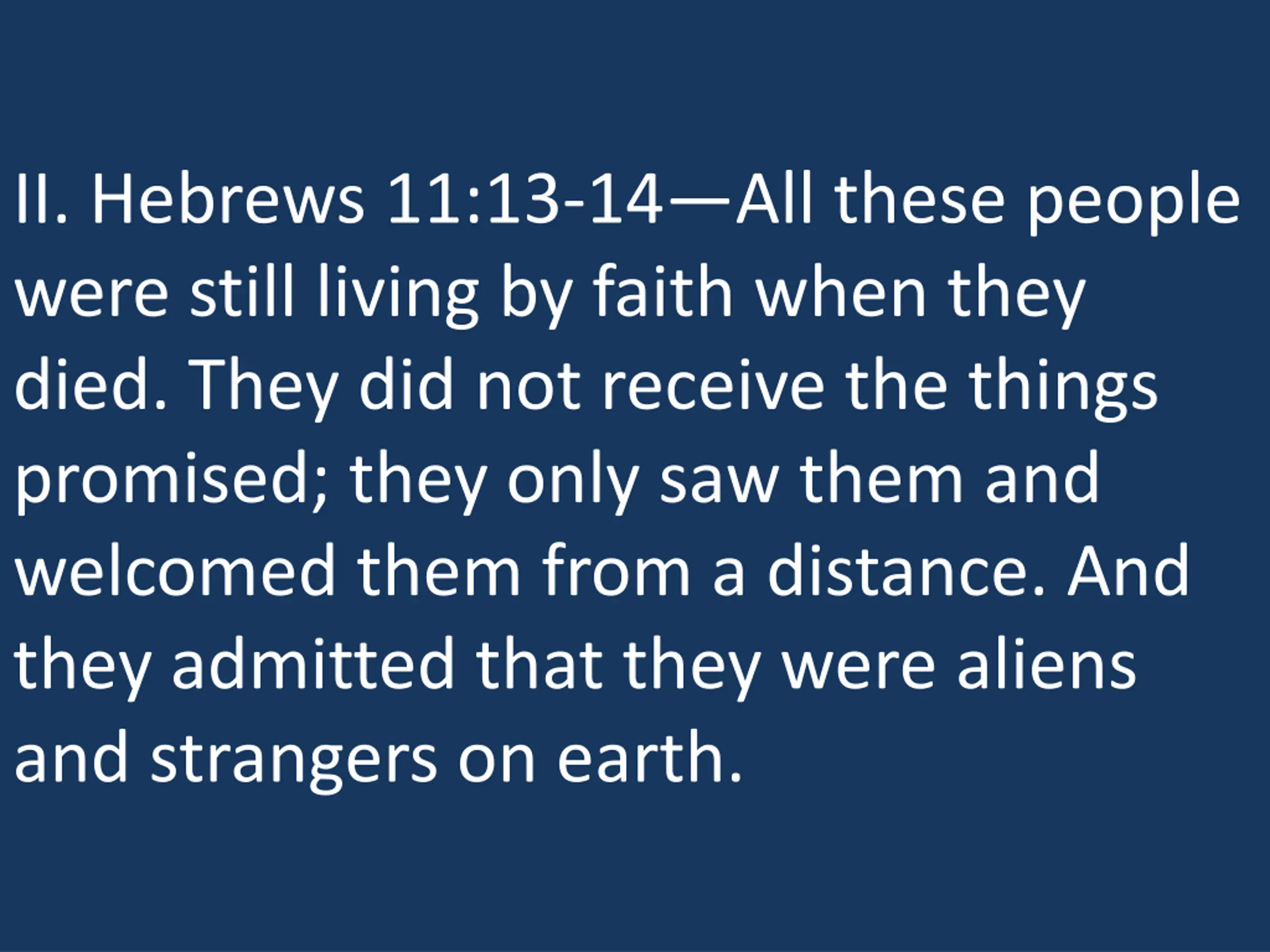 II. Hebrews 11:13-14All these people were still living by faith when they died. They did not receive the things promised; they only saw them and welcomed them from a distance. And they admitted that they were aliens and strangers on earth.
