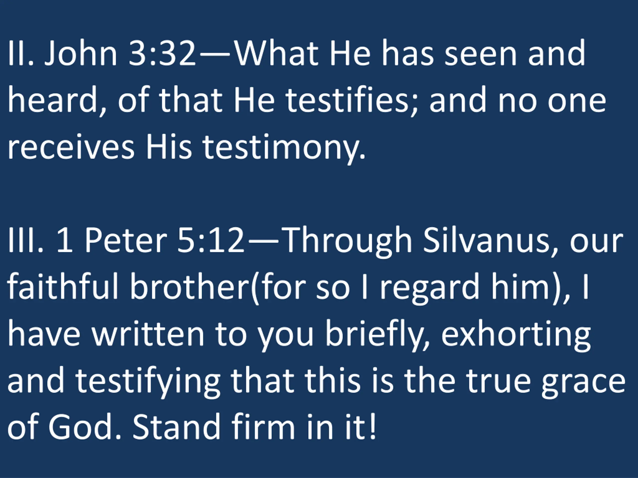 II. John 3:32What He has seen and heard, of that He testifies; and no one receives His testimony. III. 1 Peter 5:12 Through Silvanus, our faithful brother(for so I regard him), I have written to you briefly, exhorting and testifying that this is the true grace of God. Stand firm in it!