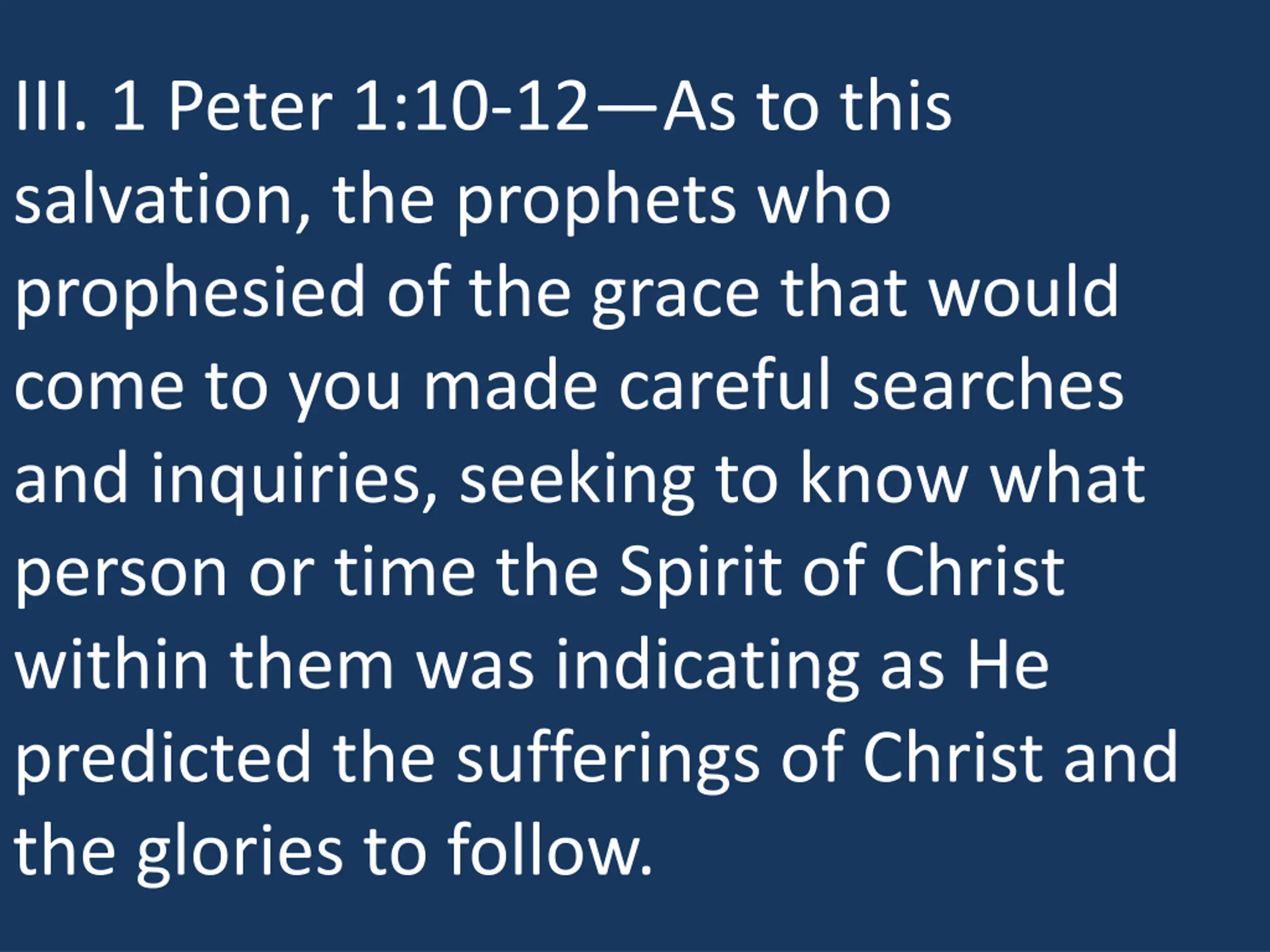 III. 1 Peter 1:10-12As to this salvation, the prophets who prophesied of the grace that would come to you made careful searches and inquiries, seeking to know what person or time the Spirit of Christ within them was indicating as He predicted the sufferings of Christ and the glories to follow.