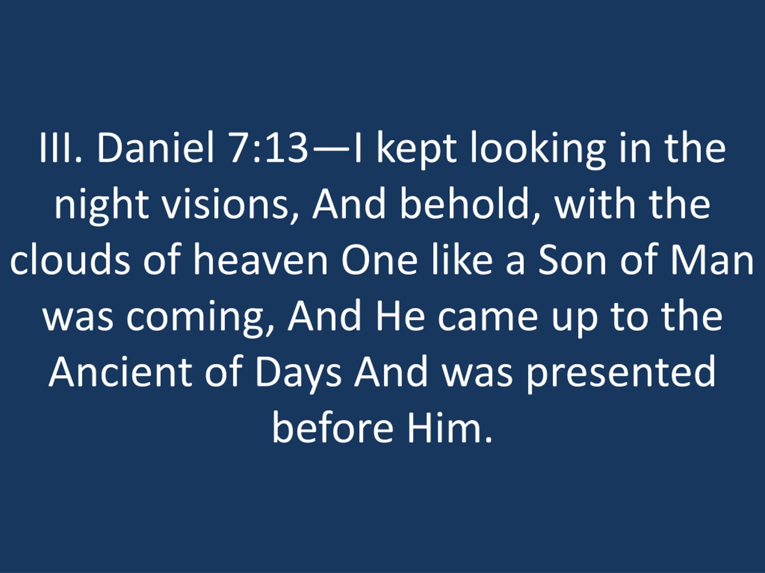 III. Daniel 7:13I kept looking in the night visions, And behold, with the clouds of heaven One like a Son of Man was coming, And He came up to the Ancient of Days And was presented before Him.