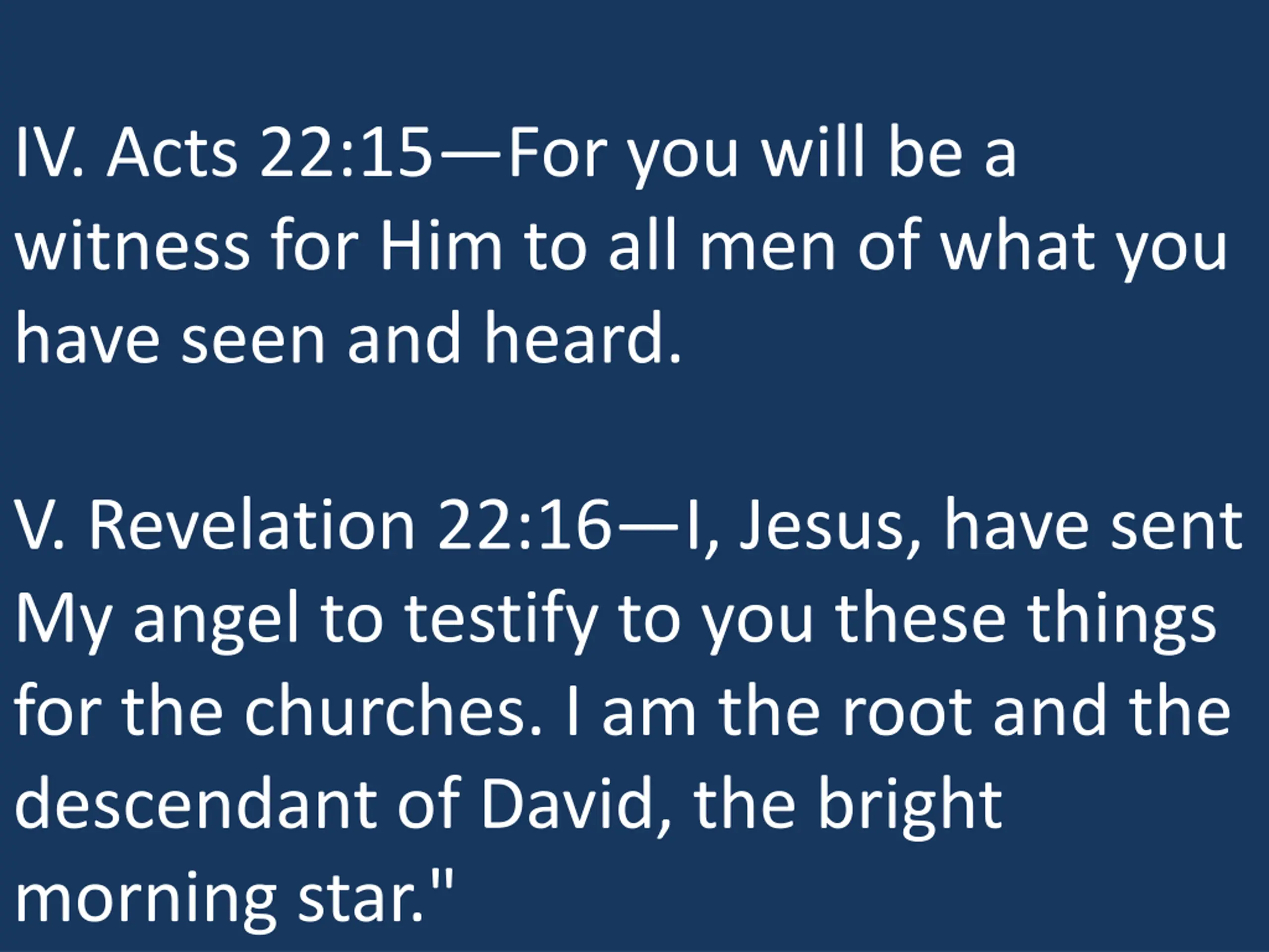 IV. Acts 22:15For you will be a witness for Him to all men of what you have seen and heard. V. Revelation 22:16 I, Jesus, have sent My angel to testify to you these things for the churches. I am the root and the descendant of David, the bright morning star."