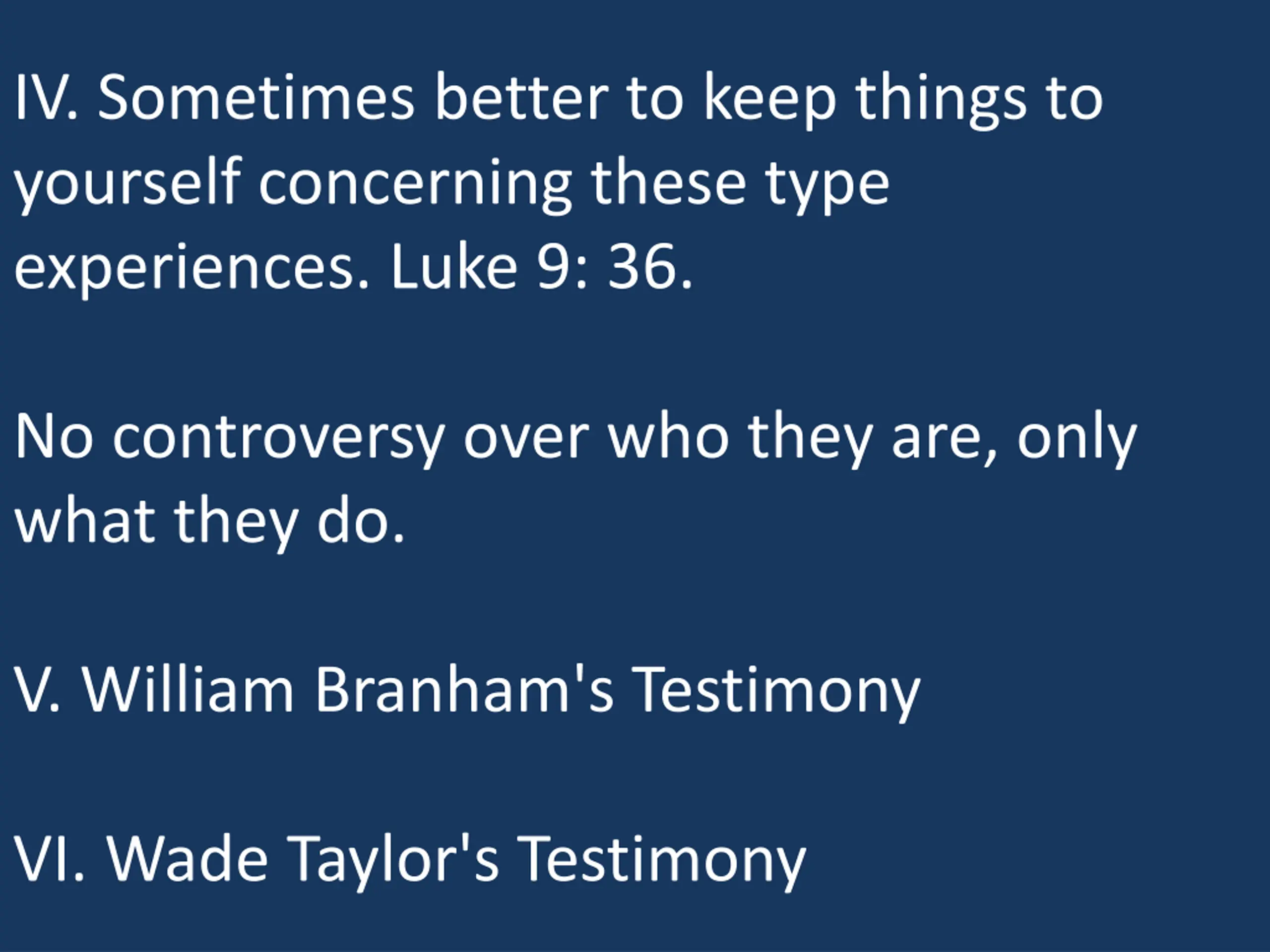 IV. Sometimes better to keep things to yourself concerning these type experiences. Luke 9: 36. No controversy over who they are, only what they do. V. William Branham's Testimony VI. Wade Taylor's Testimony