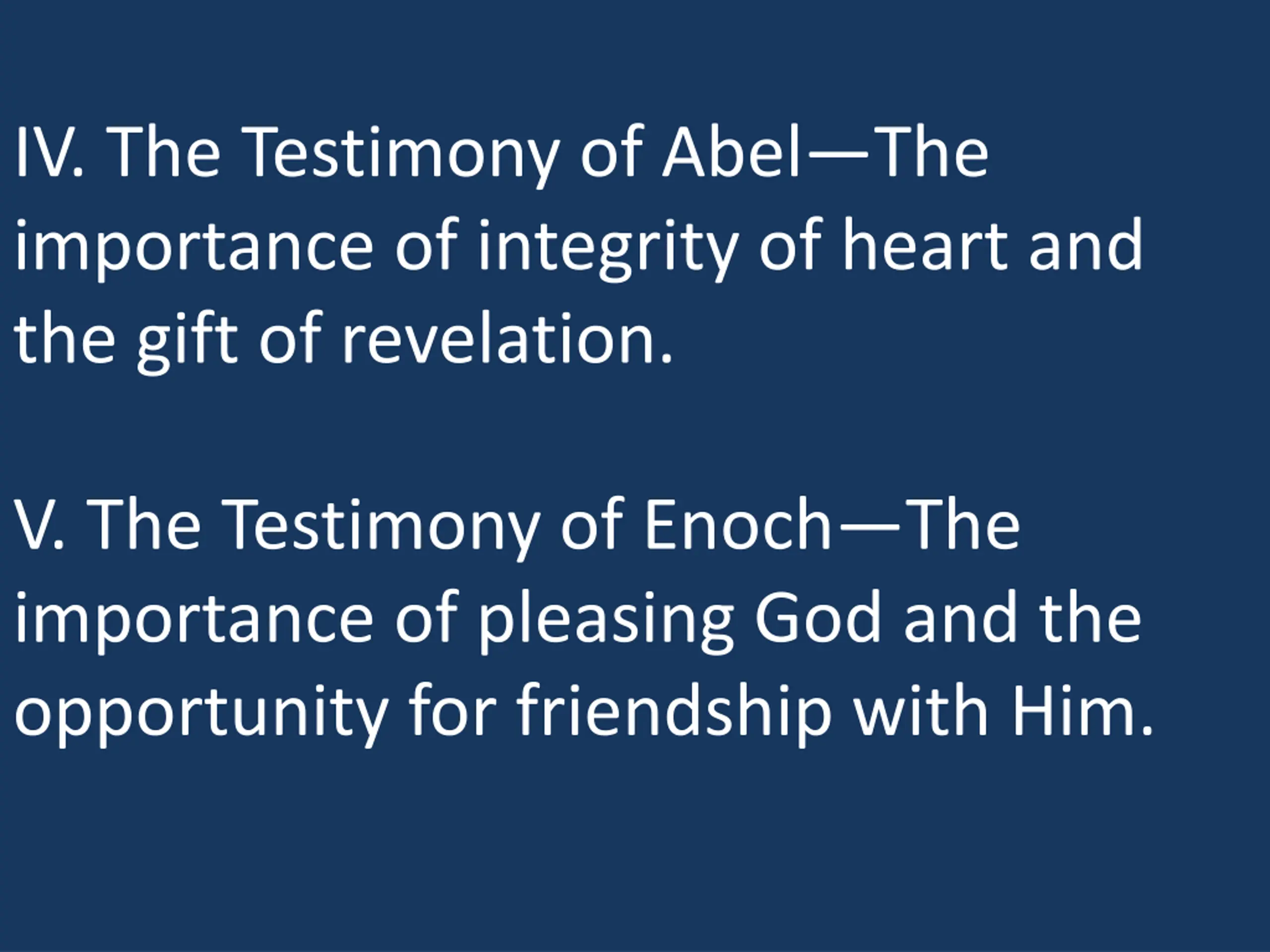 IV. The Testimony of AbelThe importance of integrity of heart and the gift of revelation. V. The Testimony of Enoch The importance of pleasing God and the opportunity for friendship with Him.