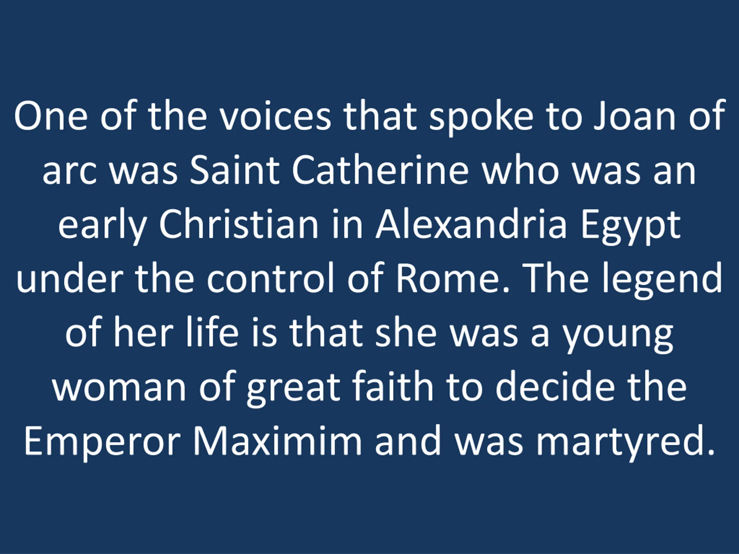 One of the voices that spoke to Joan of arc was Saint Catherine who was an early Christian in Alexandria Egypt under the control of Rome. The legend of her life is that she was a young woman of great faith to decide the Emperor Maximim and was martyred.