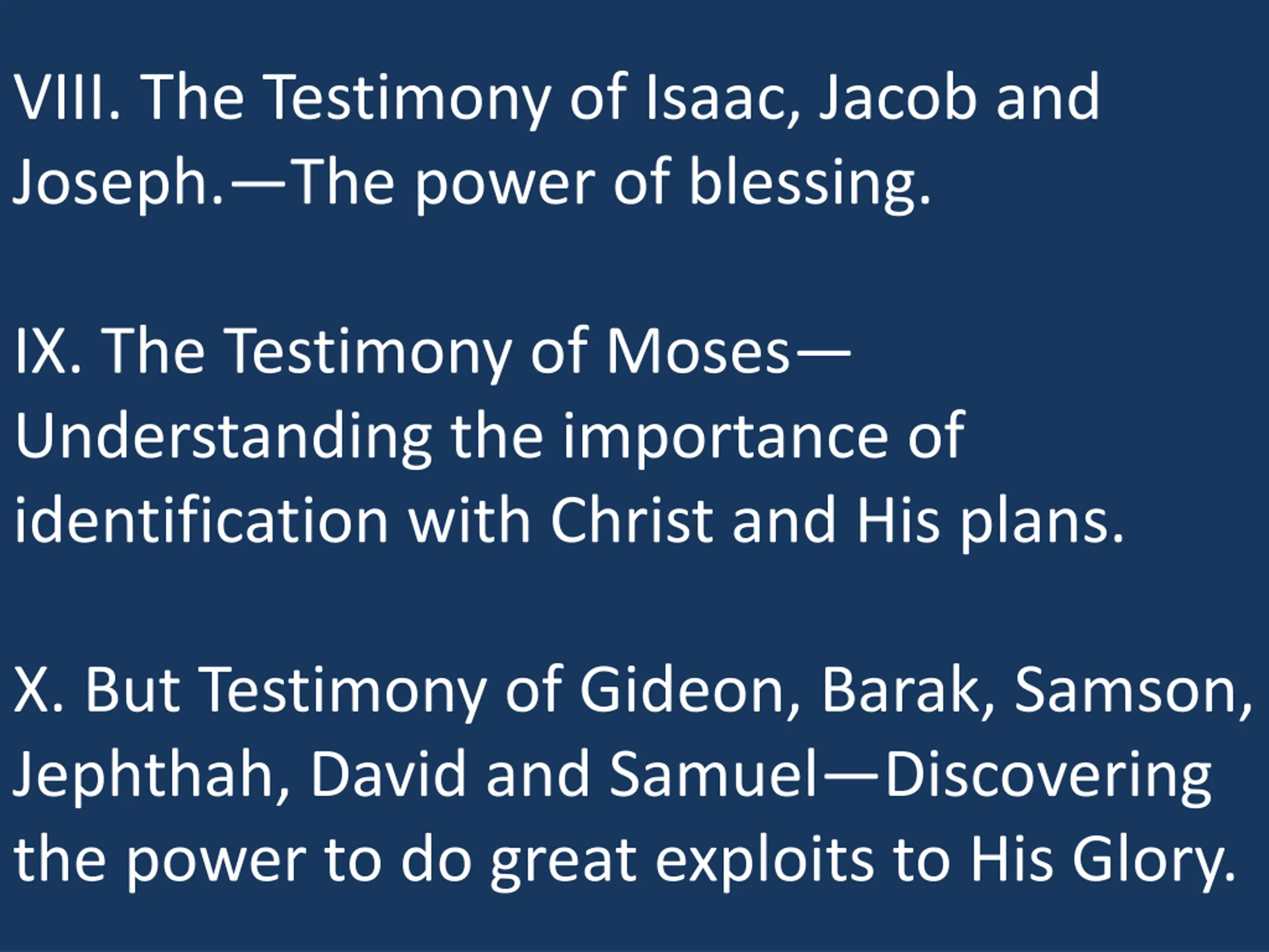 VIII. The Testimony of Isaac, Jacob and Joseph. The power of blessing. IX. The Testimony of Moses Understanding the importance of identification with Christ and His plans. X. But Testimony of Gideon, Barak, Samson, Jephthah, David and Samuel Discovering the power to do great exploits to His Glory.