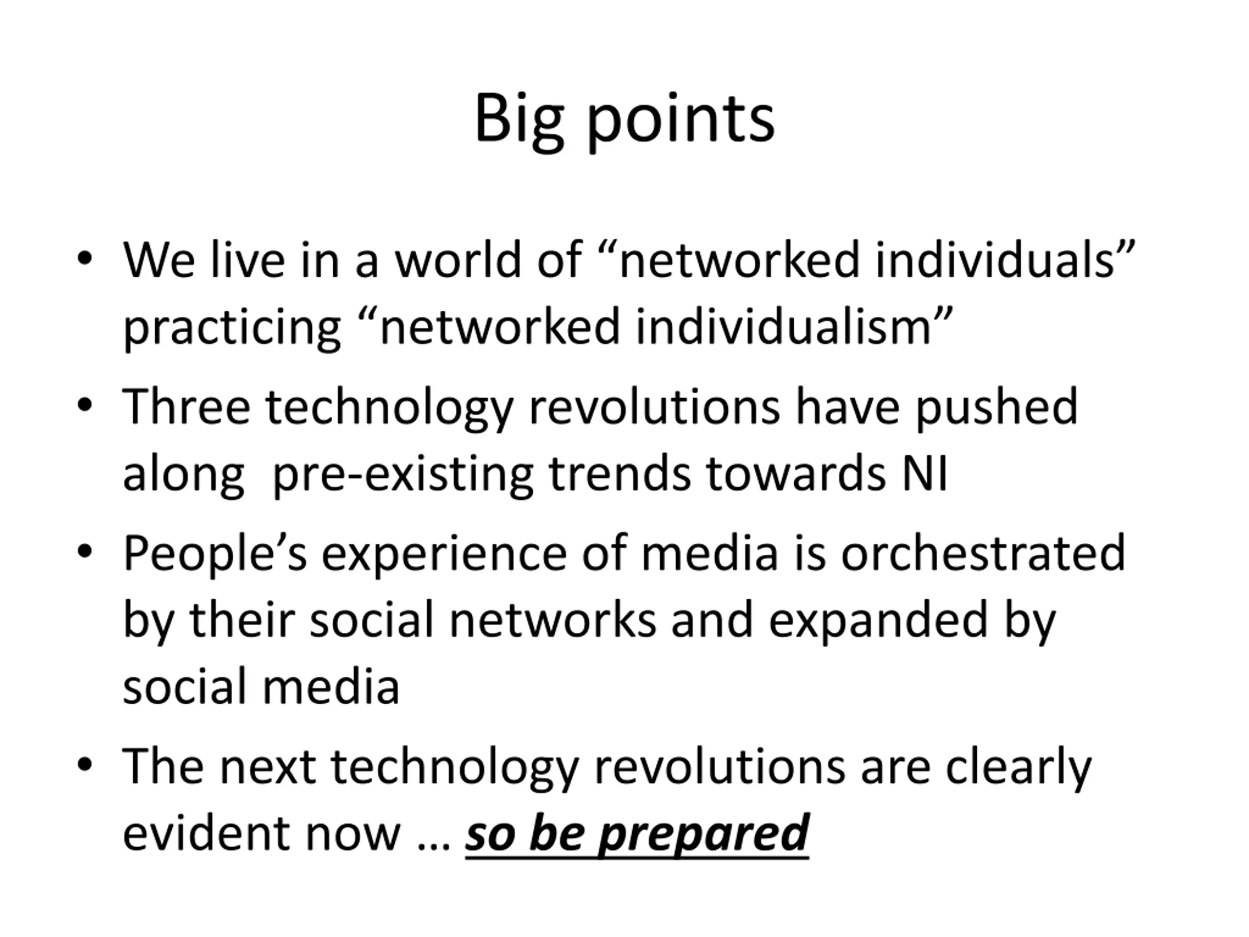 Big points We live in a world of networked individuals practicing networked individualism Three technology revolutions have pushed along pre-existing trends towards NI People s experience of media is orchestrated by their social networks and expanded by social media The next technology revolutions are clearly evident now so be prepared