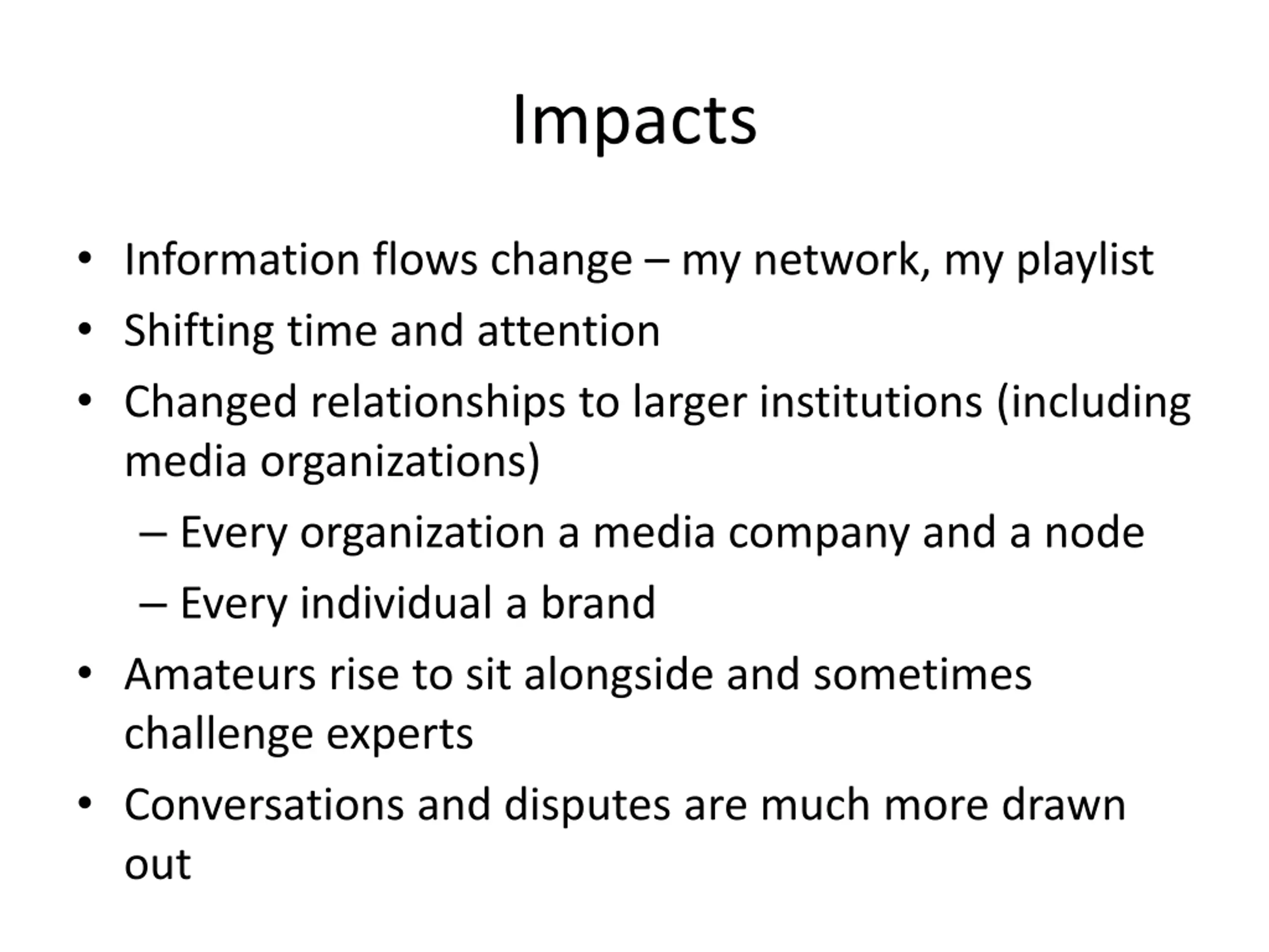 Impacts Information flows change my network, my playlist Shifting time and attention Changed relationships to larger institutions (including media organizations) Every organization a media company and a node Every individual a brand Amateurs rise to sit alongside and sometimes challenge experts Conversations and disputes are much more drawn out