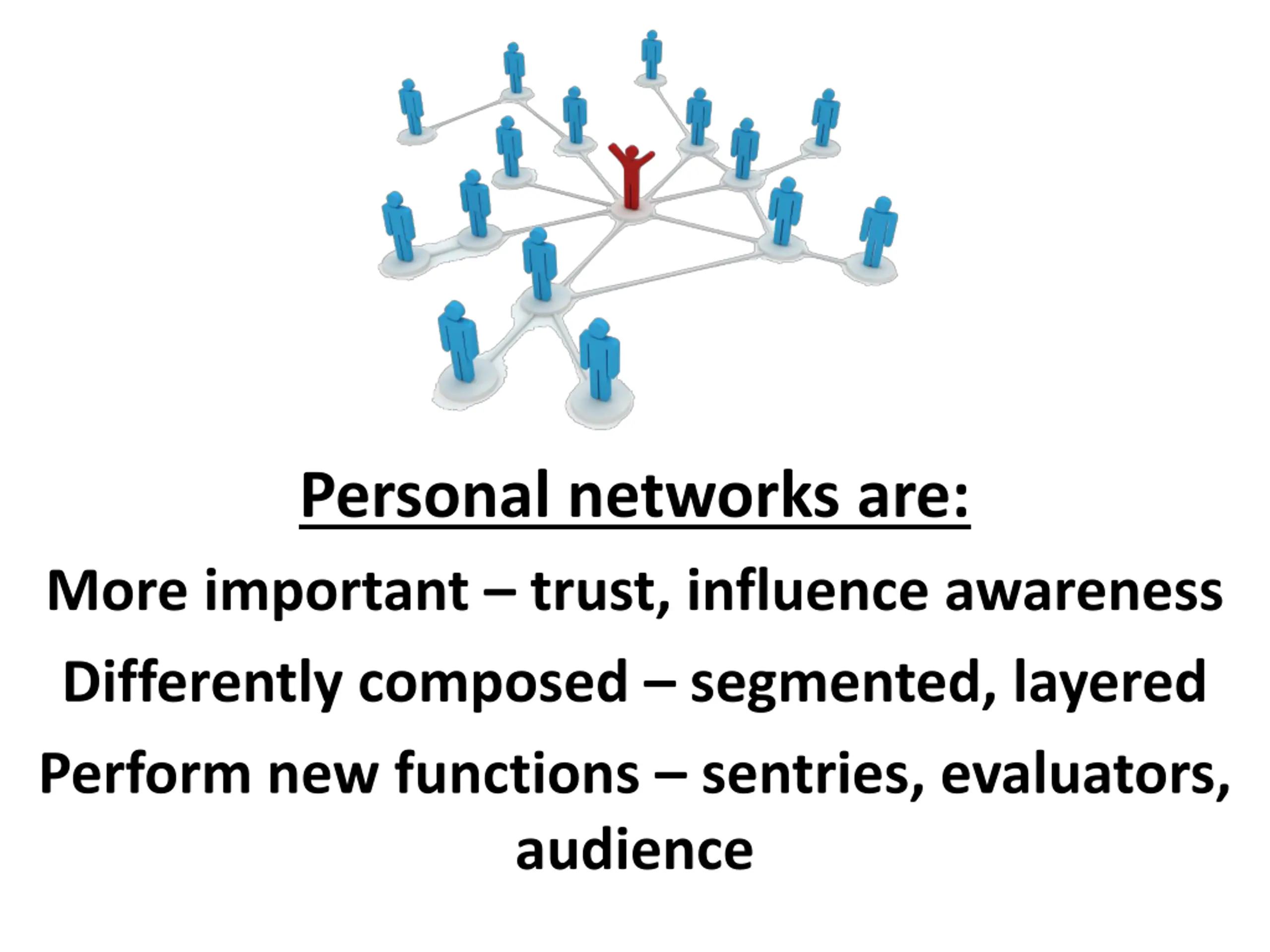 Personal networks are: More important trust, influence awareness Differently composed segmented, layered Perform new functions sentries, evaluators, audience