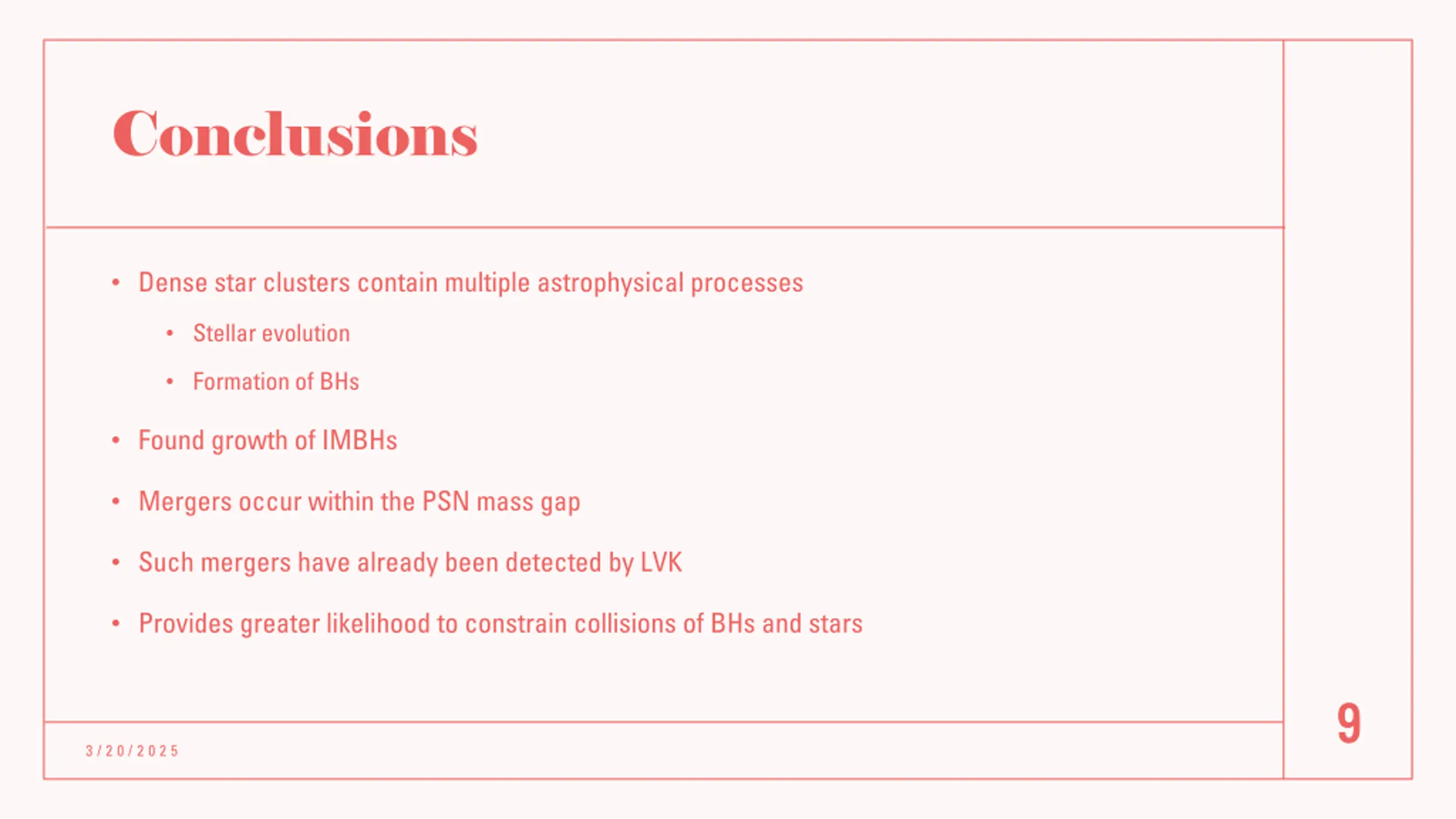 Conclusions Dense star clusters contain multiple astrophysical processes Stellar evolution Formation of BHs Found growth of IMBHs Mergers occur within the PSN mass gap Such mergers have already been detected by LVK Provides greater likelihood to constrain collisions of BHs and stars 9 9 3 / 2 0 / 2 0 2 5