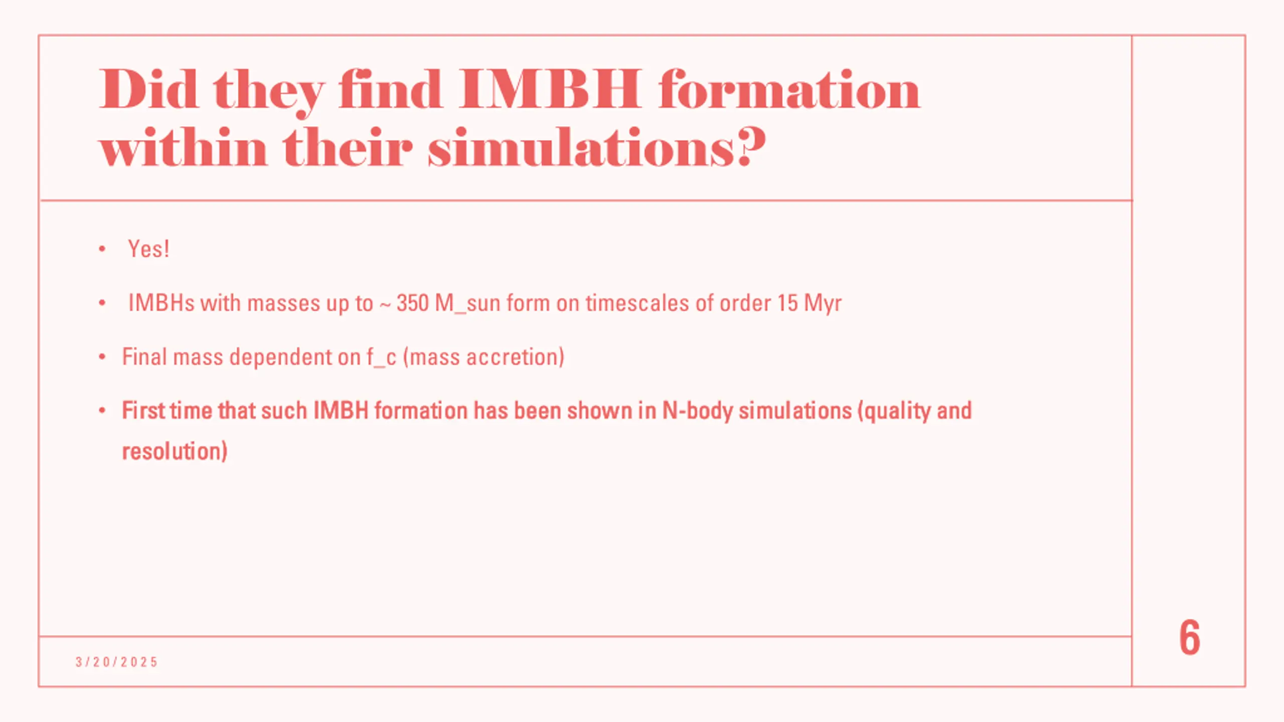 Did they find IMBH formation within their simulations? Yes! IMBHs with masses up to ~ 350 M_sun form on timescales of order 15 Myr Final mass dependent on f_c (mass accretion) First time that such IMBH formation has been shown in N First time that such IMBH formation has been shown in N- -body simulations (quality and resolution) resolution) body simulations (quality and 6 6 3 / 2 0 / 2 0 2 5