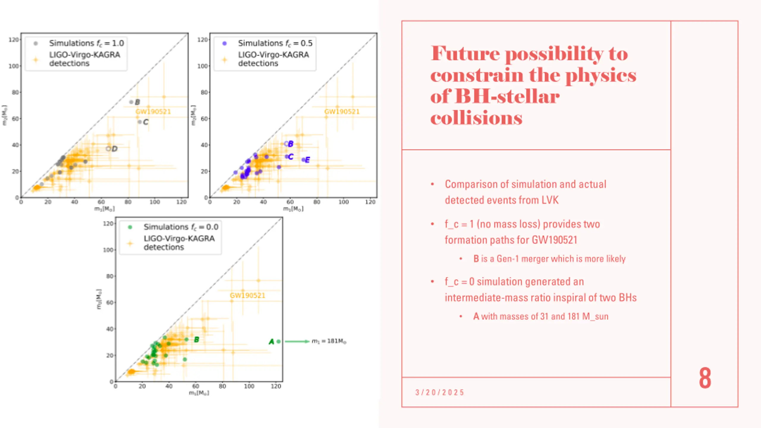 Future possibility to constrain the physics of BH-stellar collisions Comparison of simulation and actual detected events from LVK f_c = 1 (no mass loss) provides two formation paths for GW190521 B B is a Gen-1 merger which is more likely f_c = 0 simulation generated an intermediate-mass ratio inspiral of two BHs A A with masses of 31 and 181 M_sun 8 8 3 / 2 0 / 2 0 2 5