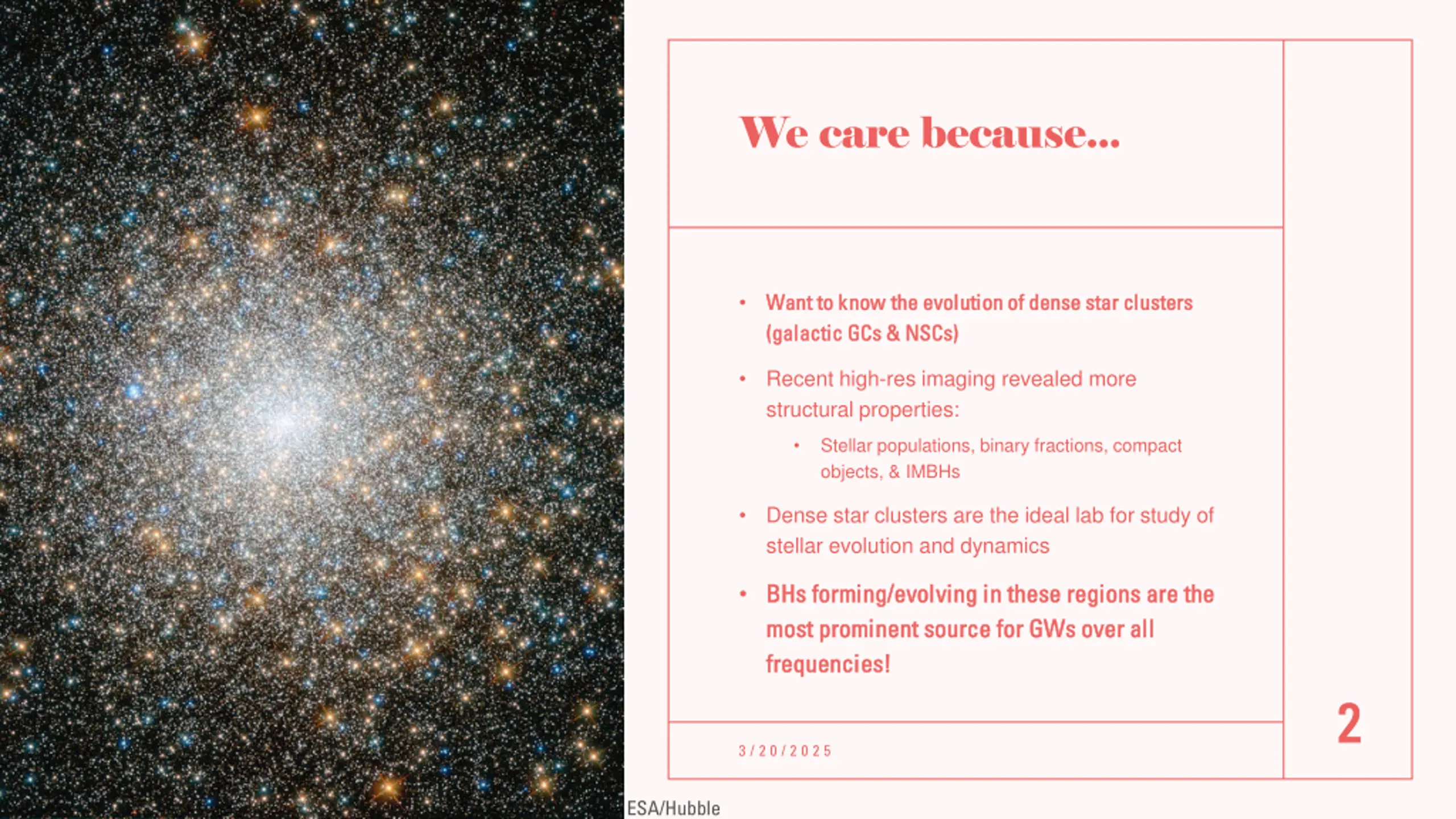 We care because... Want to know the evolution of dense star clusters Want to know the evolution of dense star clusters (galactic GCs & NSCs) (galactic GCs & NSCs) Recent high-res imaging revealed more structural properties: Stellar populations, binary fractions, compact objects, & IMBHs Dense star clusters are the ideal lab for study of stellar evolution and dynamics BHs forming/evolving in these regions are the BHs forming/evolving in these regions are the most prominent source for GWs over all most prominent source for GWs over all frequencies! frequencies! 2 2 3 / 2 0 / 2 0 2 5 ESA/Hubble