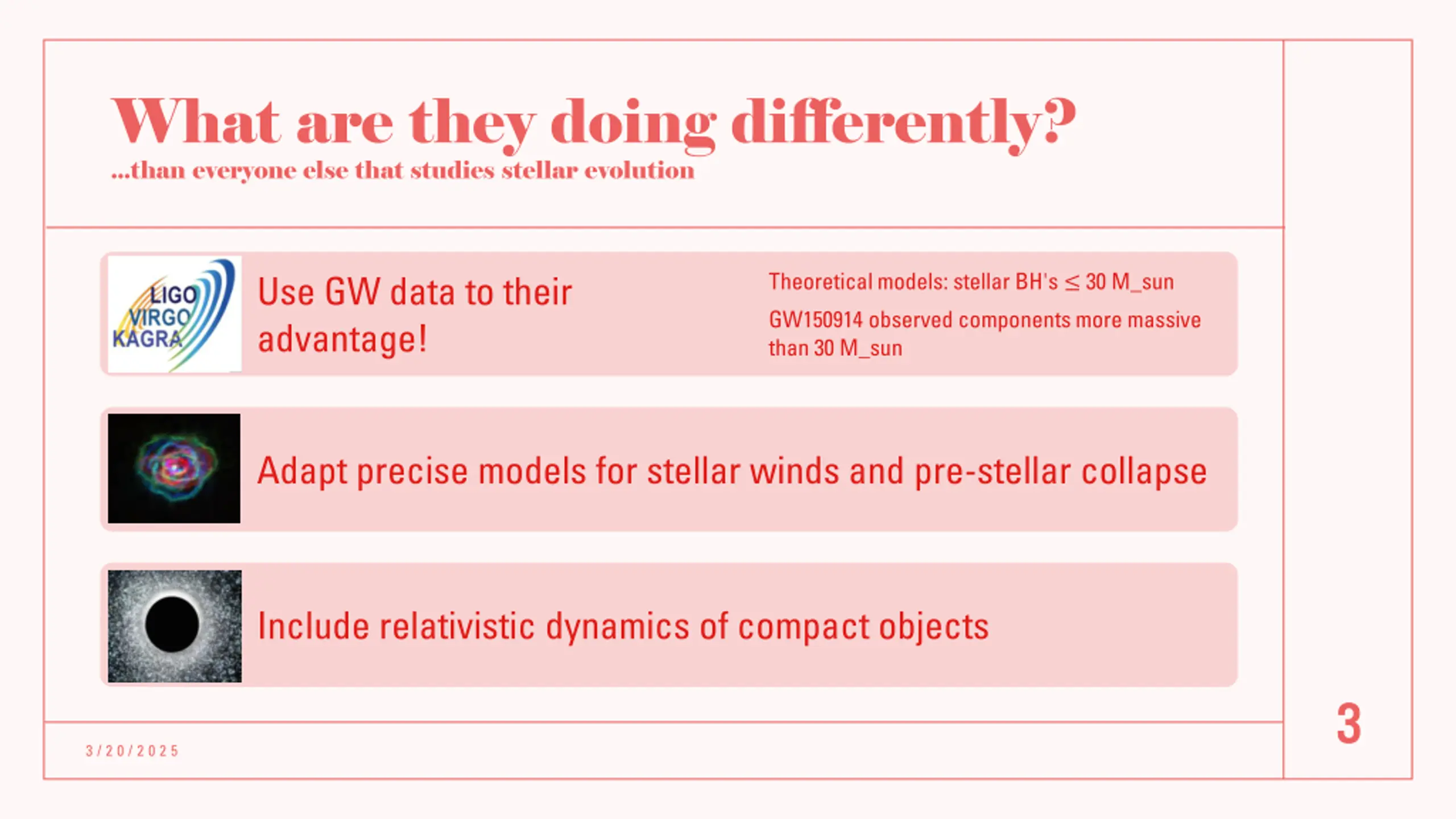 What are they doing differently? ...than everyone else that studies stellar evolution Theoretical models: stellar BH's 30 M_sun GW150914 observed components more massive than 30 M_sun Use GW data to their advantage! Adapt precise models for stellar winds and pre-stellar collapse Include relativistic dynamics of compact objects 3 3 3 / 2 0 / 2 0 2 5