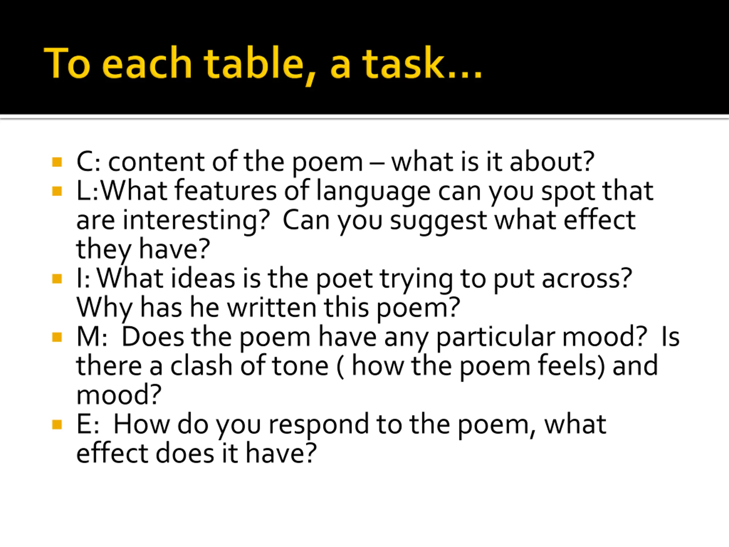 C: content of the poem what is it about? L:What features of language can you spot that are interesting? Can you suggest what effect they have? I: What ideas is the poet trying to put across? Why has he written this poem? M: Does the poem have any particular mood? Is there a clash of tone ( how the poem feels) and mood? E: How do you respond to the poem, what effect does it have?