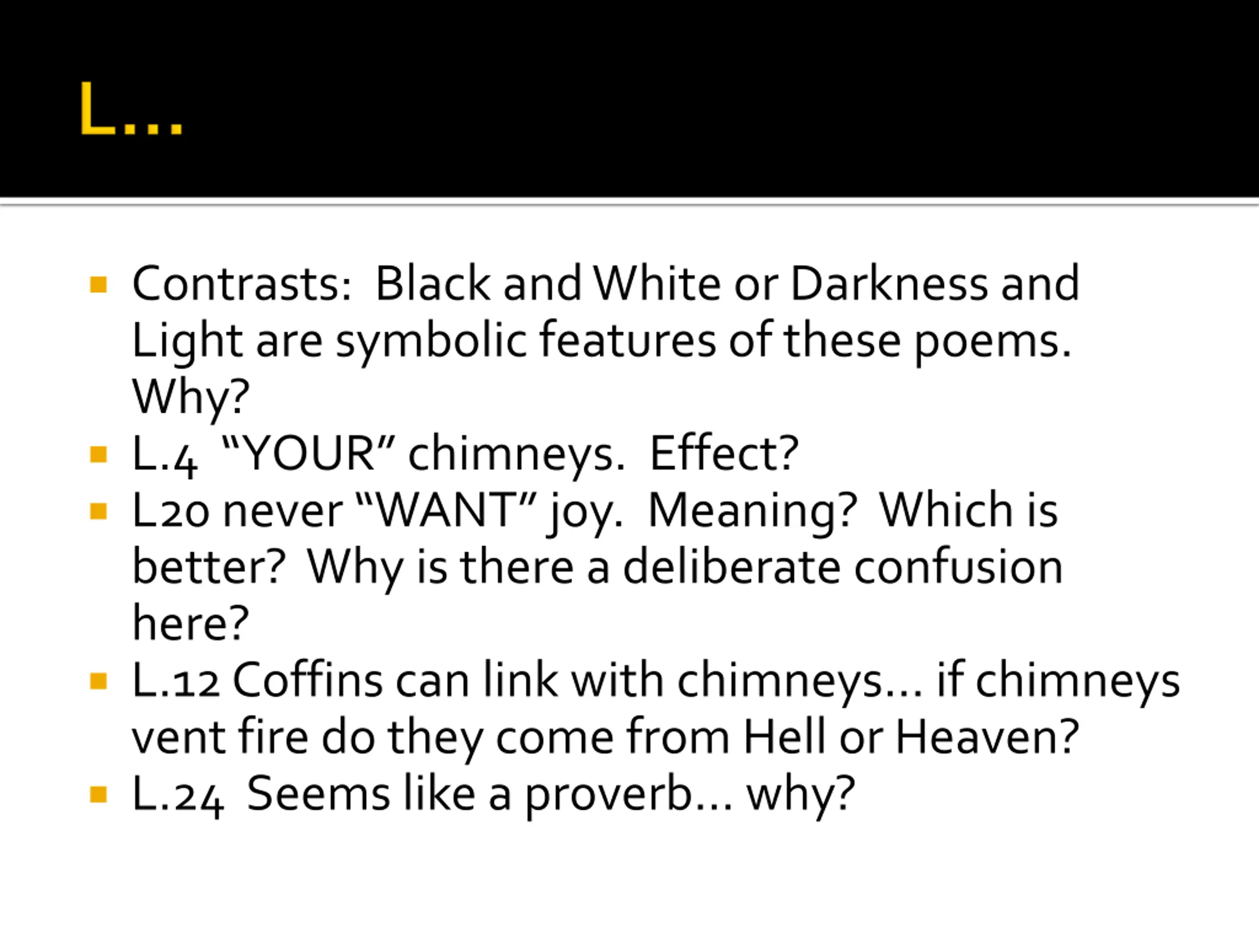 Contrasts: Black and White or Darkness and Light are symbolic features of these poems. Why? L.4 YOUR chimneys. Effect? L20 never WANT joy. Meaning? Which is better? Why is there a deliberate confusion here? L.12 Coffins can link with chimneys if chimneys vent fire do they come from Hell or Heaven? L.24 Seems like a proverb why?