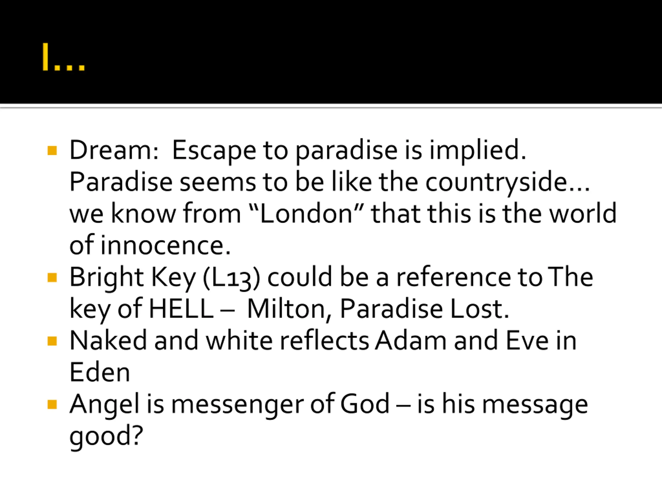 Dream: Escape to paradise is implied. Paradise seems to be like the countryside we know from London that this is the world of innocence. Bright Key (L13) could be a reference to The key of HELL Milton, Paradise Lost. Naked and white reflects Adam and Eve in Eden Angel is messenger of God is his message good?