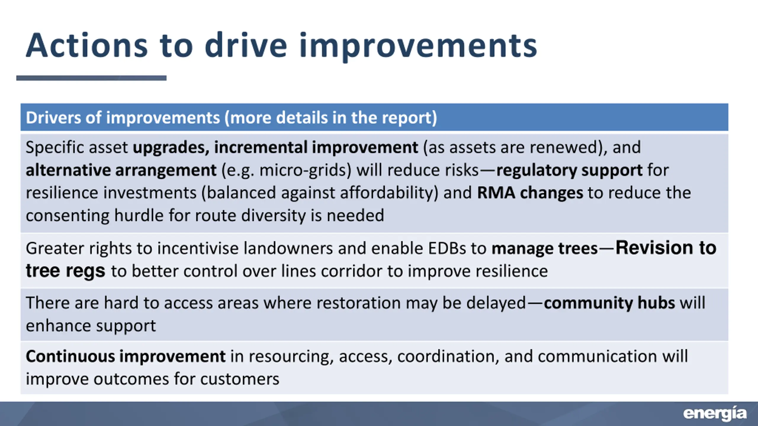 Actions to drive improvements Drivers of improvements (more details in the report) Specific asset upgrades, incremental improvement (as assets are renewed), and alternative arrangement (e.g. micro-grids) will reduce risks regulatory support for resilience investments (balanced against affordability) and RMA changes to reduce the consenting hurdle for route diversity is needed Greater rights to incentivise landowners and enable EDBs to manage trees Revision to tree regs to better control over lines corridor to improve resilience There are hard to access areas where restoration may be delayed community hubs will enhance support Continuous improvement in resourcing, access, coordination, and communication will improve outcomes for customers