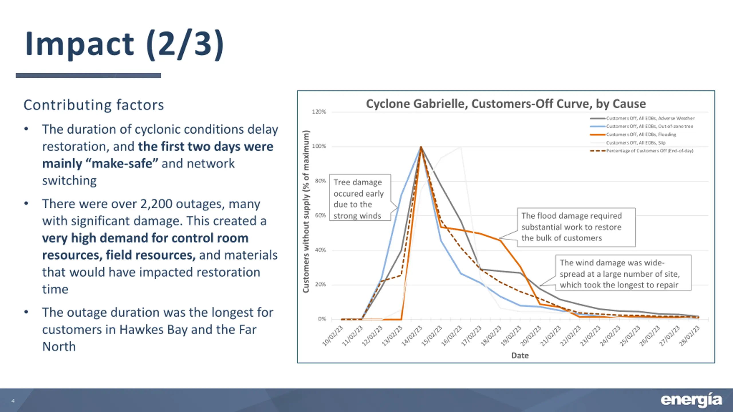 Impact (1/3) At its peak, 240,000 customers lost supply (11% of NZ) Cyclone Gabrielle, Customers-Off Curve, Outage Cause 250 Asset Damage from Out-of-Zone Trees Asset Damage from Adverse Weather (Wind and Flooding) In relation to the distribution sector Out-of-zone trees falling on lines (which are trees outside of EDBs areas of control) interrupted 67,000 customers. This was the largest single cause of outage Storms conditions above design limits interrupted a further 63,000 customers Flooding was also a material factor, impacting over 62,000 customers Asset Damage from Other Vegetation (Largely transmission related) 200 Customers without supply (000) Other Causes Out of zone trees were the largest cause of outages 150 100 50 0 10 Feb 11 Feb 12 Feb 13 Feb 14 Feb 15 Feb 16 Feb 17 Feb 18 Feb 19 Feb Date 20 Feb 21 Feb 22 Feb 23 Feb 24 Feb 25 Feb 26 Feb 27 Feb 28 Feb 3