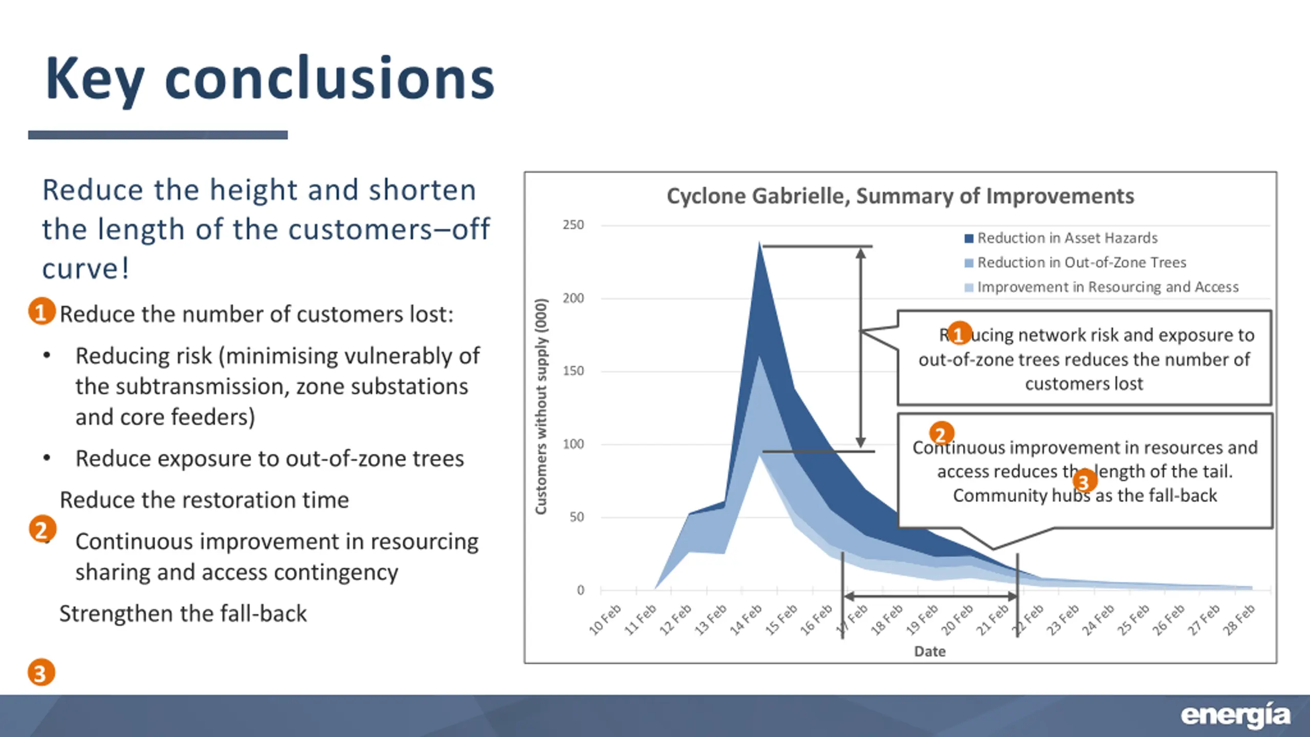 Key conclusions Reduce the height and shorten the length of the customers off curve! Cyclone Gabrielle, Summary of Improvements 250 Reduction in Asset Hazards Reduction in Out-of-Zone Trees Improvement in Resourcing and Access 200 Customers without supply (000) 1 Reduce the number of customers lost: Reducing risk (minimising vulnerably of the subtransmission, zone substations and core feeders) Reduce exposure to out-of-zone trees 1 Reducing network risk and exposure to out-of-zone trees reduces the number of customers lost 150 2 100 Continuous improvement in resources and access reduces the length of the tail. Community hubs as the fall-back 3 Reduce the restoration time Continuous improvement in resourcing sharing and access contingency 50 2 0 10 Feb 11 Feb 12 Feb 13 Feb 14 Feb 15 Feb 16 Feb 17 Feb 18 Feb 19 Feb Date 20 Feb 21 Feb 22 Feb 23 Feb 24 Feb 25 Feb 26 Feb 27 Feb 28 Feb Strengthen the fall-back 3