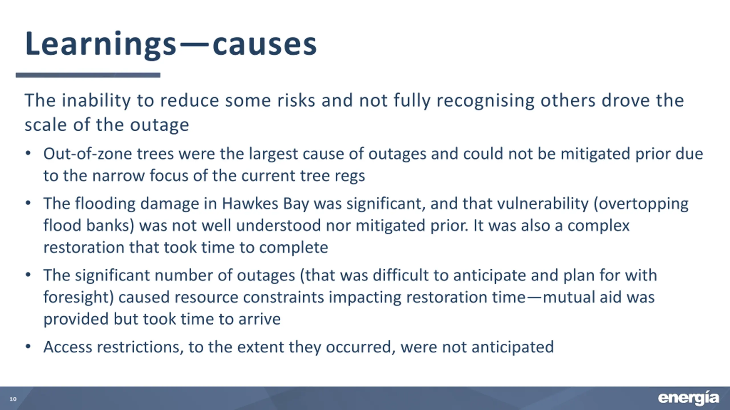 Learningscauses The inability to reduce some risks and not fully recognising others drove the scale of the outage Out-of-zone trees were the largest cause of outages and could not be mitigated prior due to the narrow focus of the current tree regs The flooding damage in Hawkes Bay was significant, and that vulnerability (overtopping flood banks) was not well understood nor mitigated prior. It was also a complex restoration that took time to complete The significant number of outages (that was difficult to anticipate and plan for with foresight) caused resource constraints impacting restoration time mutual aid was provided but took time to arrive Access restrictions, to the extent they occurred, were not anticipated 10