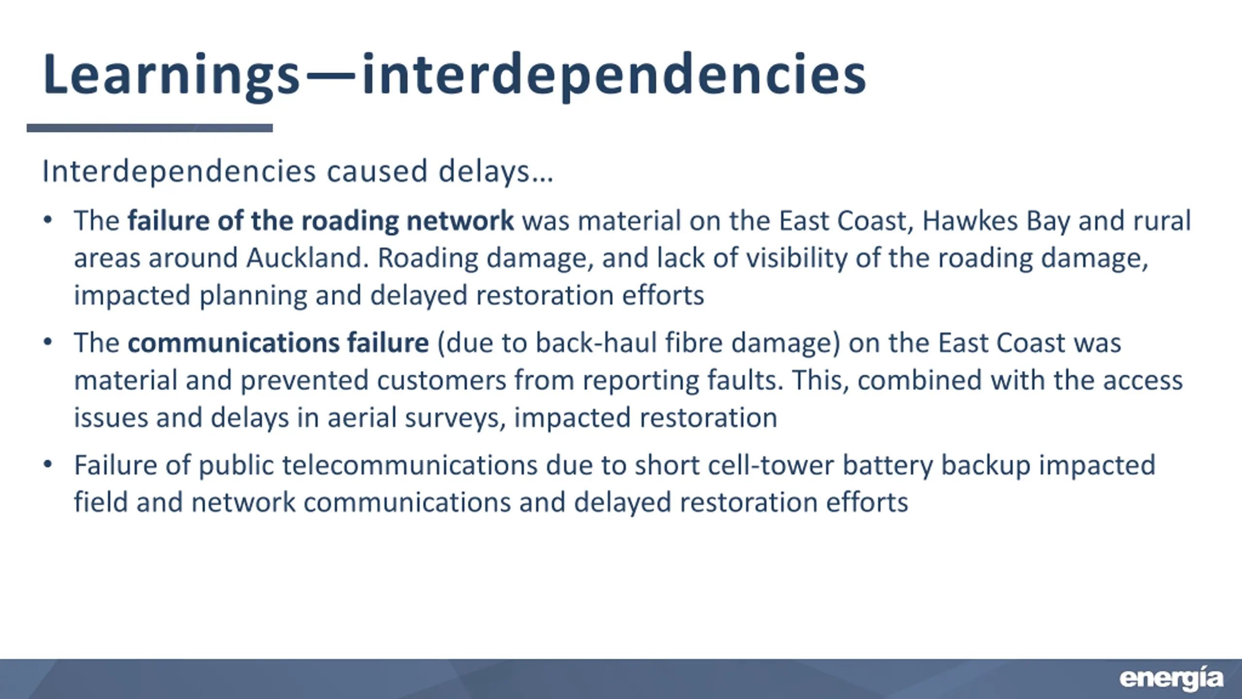 Learningsinterdependencies Interdependencies caused delays The failure of the roading network was material on the East Coast, Hawkes Bay and rural areas around Auckland. Roading damage, and lack of visibility of the roading damage, impacted planning and delayed restoration efforts The communications failure (due to back-haul fibre damage) on the East Coast was material and prevented customers from reporting faults. This, combined with the access issues and delays in aerial surveys, impacted restoration Failure of public telecommunications due to short cell-tower battery backup impacted field and network communications and delayed restoration efforts